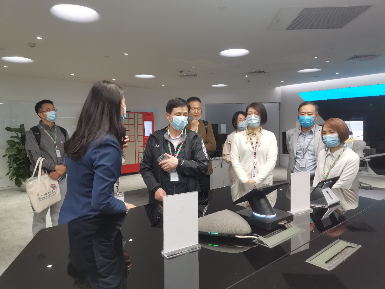 學校調研團在聯想集團高教客戶經理潘思彤等人的陪同下參觀了聯想集團全球未來中心和可靠性綜合環境實驗室。隨后雙方領導及成員會面,并就科技項目合作、實驗室建設、人才培養及就業等領域進行商討。
