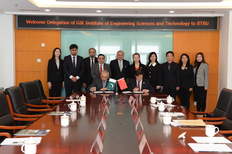 會(huì)談后,孫寶國校長和賈吉汗·巴沙爾校長分別代表兩校簽訂了北京工商大學(xué)和巴基斯坦GIK工程科技學(xué)院諒解合作備忘錄。