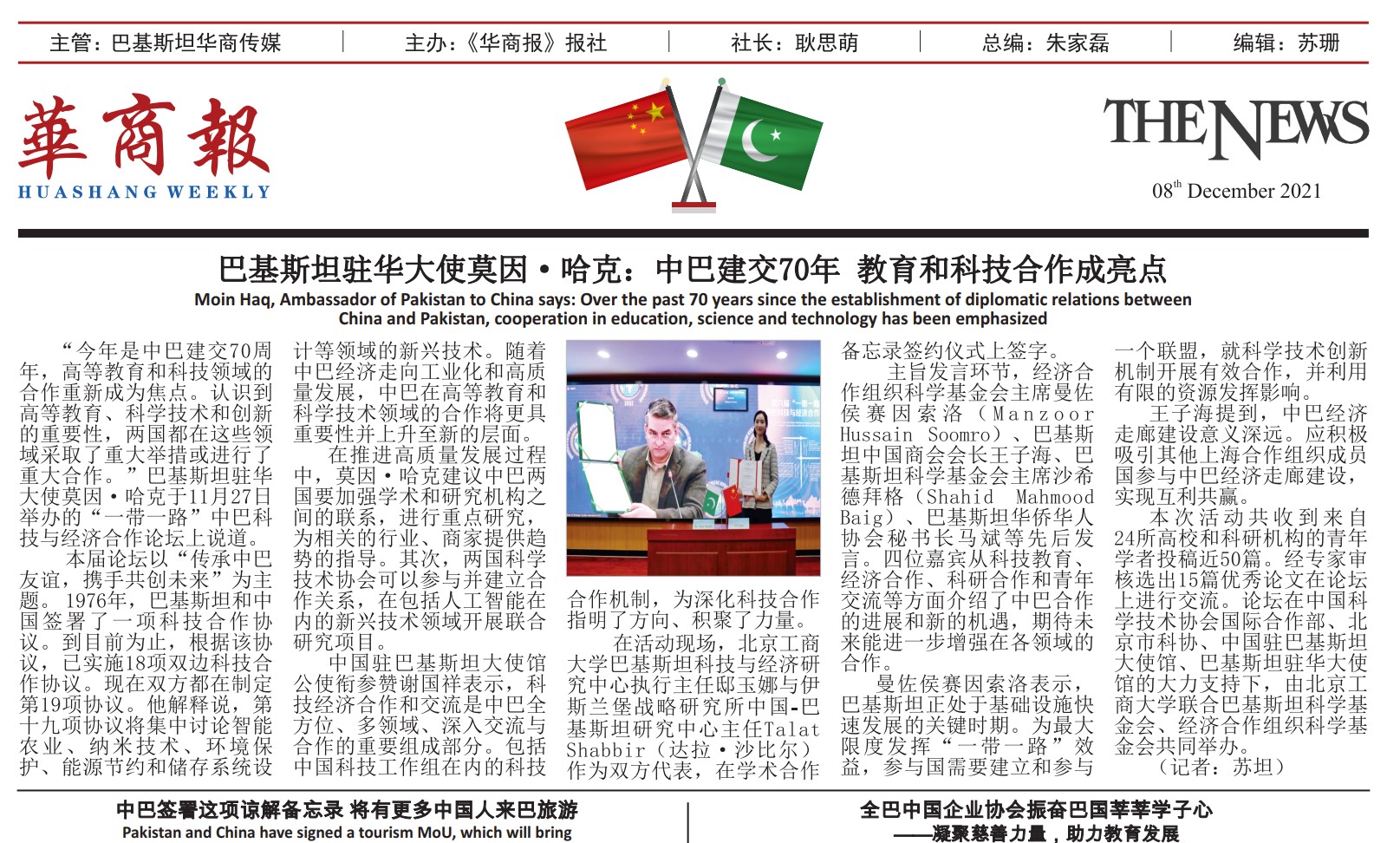11月27日,在中國科學技術協會國際合作部、北京市科協、中國駐巴基斯坦大使館、巴基斯坦駐華大使館的大力支持下,我校聯合巴基斯坦科學基金會、經濟合作組織科學基金會以“傳承中巴友誼,攜手共創未來”為主題共同舉辦了第六屆“一帶一路”中巴科技與經濟合作論壇。北京工商大學黨委書記黃先開,中國科協國際合作部副部長王慶林,巴基斯坦駐華大使館大使莫因·哈克,中國駐巴基斯坦大使館公使銜參贊謝國祥,經濟合作組織科學基金會主席曼佐爾·侯賽因·索洛,巴基斯坦科學基金會主席沙希德·拜格,伊斯蘭堡戰略研究所中國巴基斯坦研究中心主任達拉·沙比爾,北京科技國際交流中心副主任蘆曉鵬,巴基斯坦中國商會會長王子海,巴基斯坦華僑華人協會秘書長馬斌,上合國家青年平臺親善大使明竺等出席了論壇。論壇以線上加線下的方式進行,200多名中巴專家和學者參加了會議。北京工商大學副校長徐丹丹主持開幕式。會后多家國內外媒體以中文、英文、烏爾都語等對論壇進行了報道,彰顯了我校在中巴建交70周年之際舉辦此次論壇的重要意義和積極作用。