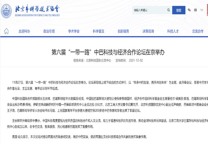 【北京市科學技術協會】第六屆“一帶一路”中巴科技與經濟合作論壇在京舉辦