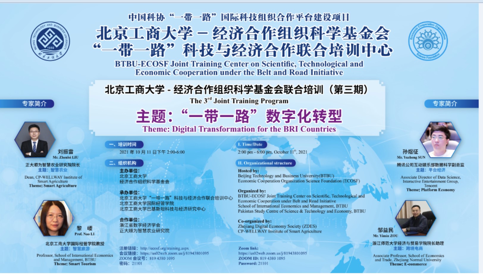 10月11日,我校與經濟合作組織科學基金會(ECO Science Foundation)聯合主辦第三期國際培訓,培訓主題為“一帶一路”數字化轉型。學校副校長徐丹丹出席會議并致辭。來自10多個國家的研究機構、企業、科技組織、政府部門代表等通過線上平臺參與培訓。國際交流與合作處副處長(主持工作)賀冬萌參加培訓。培訓由經濟合作組織科學基金會科技官員哈利勒·拉扎、聯合培訓中心主任邸玉娜及國際經管學院韓璐博士共同主持。