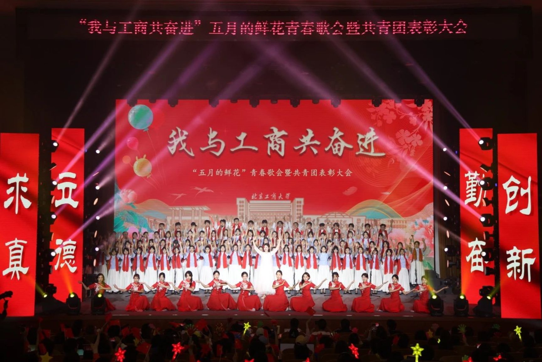 在校合唱團(tuán)、管樂(lè)團(tuán)帶來(lái)的《北京工商大學(xué)校歌》悠揚(yáng)的歌聲中,全體北工商人齊唱校歌,激揚(yáng)奮進(jìn)斗志,大會(huì)圓滿落幕。