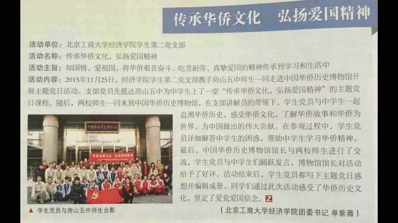 3月,北京市委綜合性黨員教育刊物《北京支部生活》第三期刊登了以《傳承華僑文化弘揚愛國精神——北京工商大學經(jīng)濟學院學生黨支部攜手房山五中走進中國華僑歷史博物館》為題的主題黨日活動?,F(xiàn)將全文轉(zhuǎn)載如下: