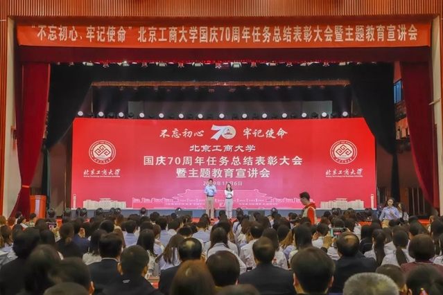 國青年報(bào)客戶端訊(中國青年報(bào)·中國青年網(wǎng)記者 葉雨婷)11月6日下午,北京工商大學(xué)在良鄉(xiāng)校區(qū)隆重舉行“不忘初心、牢記使命”國慶70周年任務(wù)總結(jié)表彰大會暨主題教育宣講會。國慶任務(wù)參與人員和服務(wù)保障人員、師生代表2000余人參加大會。