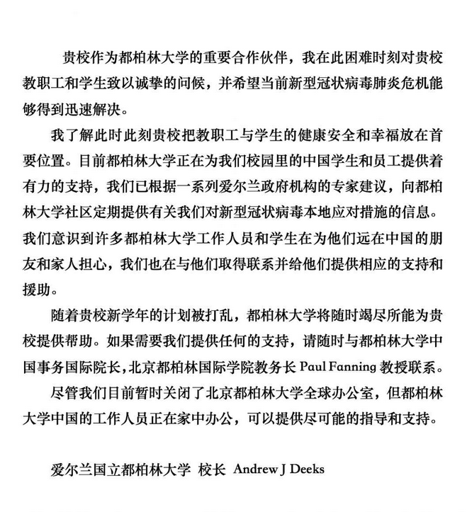愛爾蘭都柏林大學(xué)校長(zhǎng) Andrew J Deeks發(fā)來問候: