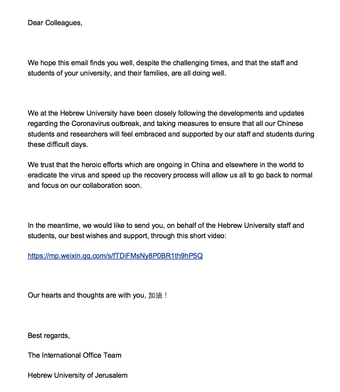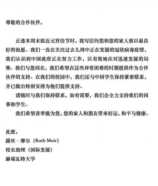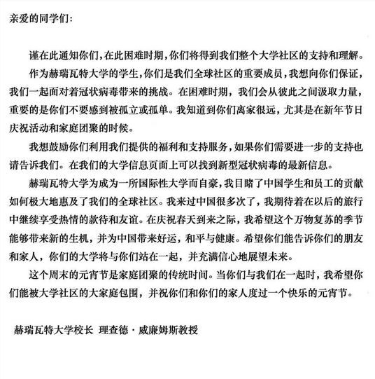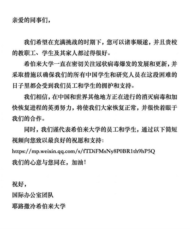 在中國(guó)抗擊疫情這一困難時(shí)期,我以此信表達(dá)我校對(duì)貴校堅(jiān)定不移的支持和關(guān)切。期待在不久的將來,兩校共同前行,走向更美好的未來。