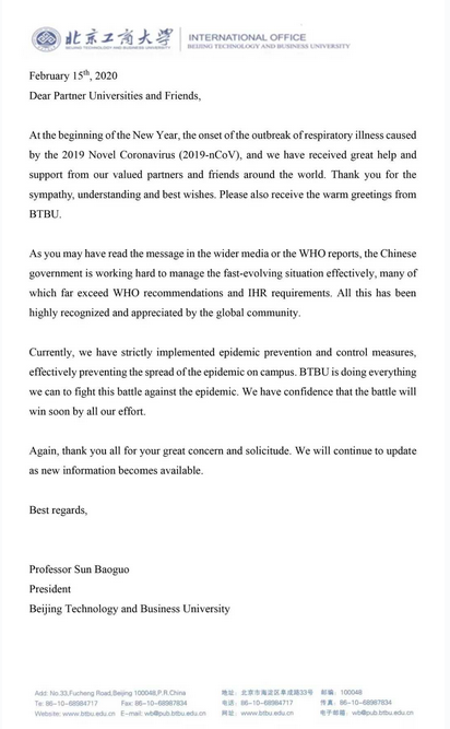 孫寶國(guó)校長(zhǎng)第一時(shí)間代表學(xué)校致函回復(fù),介紹了全國(guó)上下一心共抗疫情的堅(jiān)決舉措,學(xué)校應(yīng)對(duì)新冠肺炎的行動(dòng),并對(duì)合作院校的關(guān)心和問候表示感謝。學(xué)校國(guó)際交流與合作處(港澳臺(tái)辦公室)也向合作伙伴進(jìn)行了誠(chéng)摯感謝和回復(fù)。
