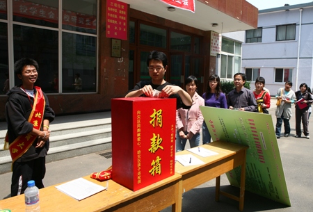 在捐款現(xiàn)場,我們看到有很多是以班級或集體為單位進行捐款的,其中有機械054班、藝設(shè)062班、營銷051和052、法學(xué)071班等,它們都是利用課間時間,組織大家捐錢的,其中營銷班的同學(xué)們還將賣雜志,拉贊助的錢也捐了出來。奧運會志愿者骨干班也將芙蓉學(xué)子獎學(xué)金5000元全部捐給了災(zāi)區(qū)人民,志愿者骨干班代表李俊向記者介紹道:“作為一名志愿者,我們有義務(wù)向災(zāi)區(qū)人民奉獻我們的愛心,我們希望大家能夠眾志成城,抗擊震災(zāi),錢雖然不多,但是盡了我校奧運志愿者的微薄之力。”信息學(xué)院的學(xué)生會、青志協(xié)、團總支干部,也自發(fā)集體捐款,信息學(xué)院還在得知地震發(fā)生后,以最快的時間出了一期海報,鼓勵災(zāi)區(qū)人民挺住,希望他們能夠平安。經(jīng)濟學(xué)院和會計學(xué)院團總支前期也分別在院系組織了捐款活動,捐款金額分別為37000余元和29000余元.