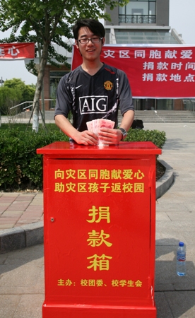 新聞051的吳鑫陽同學(xué)捐了600元,她向我們說這是他芙蓉學(xué)子的獎學(xué)金,這幾天每次看新聞都感動地落淚,自己現(xiàn)在不能夠到災(zāi)區(qū)幫助他們,只能夠在這里為他們祈禱了。信息學(xué)院的團總支書記曹卉老師說:“電器051班班長白爽因為生病住院不能前來捐款,特別讓我來幫助她捐款200元”。食堂后勤工作人員由于中午時間在工作,不能過來捐款,但他們已將錢交給了有關(guān)的組織部門。外籍老師戴子.蘇利文也在捐款箱前停住了腳步捐出了300元錢,當我們的工作人員向他說“thank you ”的時候,他笑著向大家擺手。當我們的記者來到取款機前時,這里也排起了長長的隊伍,都是等待取錢捐款的學(xué)生。