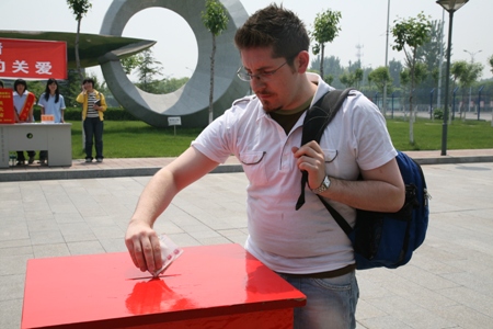 記者在現(xiàn)場隨機采訪了很多捐款的同學(xué)。同學(xué)們都表示,這幾天一直通過網(wǎng)絡(luò)、電視新聞、手機報、收音機等媒介時時刻刻關(guān)注著災(zāi)區(qū)人民的情況,工商063班的徐堯舜說:“得知地震發(fā)生后,大家都比較震驚,紛紛給四川的朋友打電話表示 問 候,這幾天一直在看新聞,希望災(zāi)區(qū)的人民一切都好”。其他同學(xué)也紛紛表示“四川能挺住,中國沒問題”、“每一次看新聞,心里酸酸的,希望那里的災(zāi)民早一點重建家園”。除了捐現(xiàn)金以外,很多同學(xué)這幾天一直拿著手機發(fā)著同一條短信,那就是發(fā)送1或2到1069999301,為災(zāi)區(qū)捐上一元錢,那里的人民就有多了一份希望。