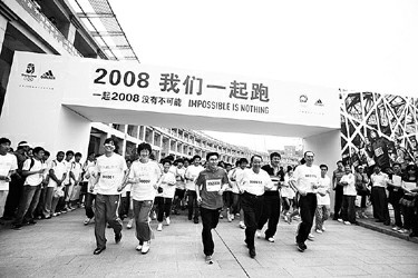 昨天下午,北京工商大學校園內人頭攢動,“阿迪達斯助威奧運全民跑步活動”在此盛大啟動,來自首都各大高校的2008名師生,并肩跑完了“2008,我們一起跑”奧運全民跑步的第一個2008米。