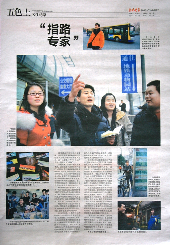 在做志愿者的日子里,韓昱琦對每個乘客都笑臉相迎,即使口干舌燥也會耐心解答。一年多來,他已經(jīng)為一萬多人解決了各種乘車問題。在固定的志愿工作之外,生活中的韓昱琦也會充分發(fā)揮公交達(dá)人的特點(diǎn),為大家的出行提供各種幫助,通過開通“公交達(dá)人韓昱琦”的微博,公布問路QQ等,隨時為需要的同學(xué)和網(wǎng)友服務(wù)。他的事跡先后被《北京青年報(bào)》、BTV、《人民日報(bào)》、《大學(xué)生》等媒體報(bào)道。2012年12月,韓昱琦被評為我校學(xué)習(xí)雷鋒先進(jìn)個人。