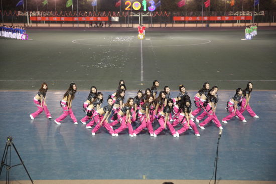 青春的節奏,讓朝氣蓬勃的大學生伴隨著樂聲在運動場上綻放出最美的年華。來自商學院、經濟學院、藝術與傳媒學院、計信學院以及材機學院的1008名大一女生踏著歡快的啦啦操歌曲驚現“舞臺”。她們身著紅色和黃色制服,高舉手花,用各式各樣的隊形淋漓盡致地展現著“巾幗不讓須眉”的氣魄。長久的期盼在此刻化作了自信的笑容洋溢在每一位同學的臉上,她們用年輕人的青春蓬勃繪出了一幅又一幅壯美的畫卷:“小飛機”、“2013”、“花團錦簇”不斷地展現在觀眾的視野中。指導教師王立紅說,團體操的訓練讓同學們都參與到了體育鍛煉中,看到大家這樣辛苦訓練的成果在此刻展現,我們真正做到了為自己加油。