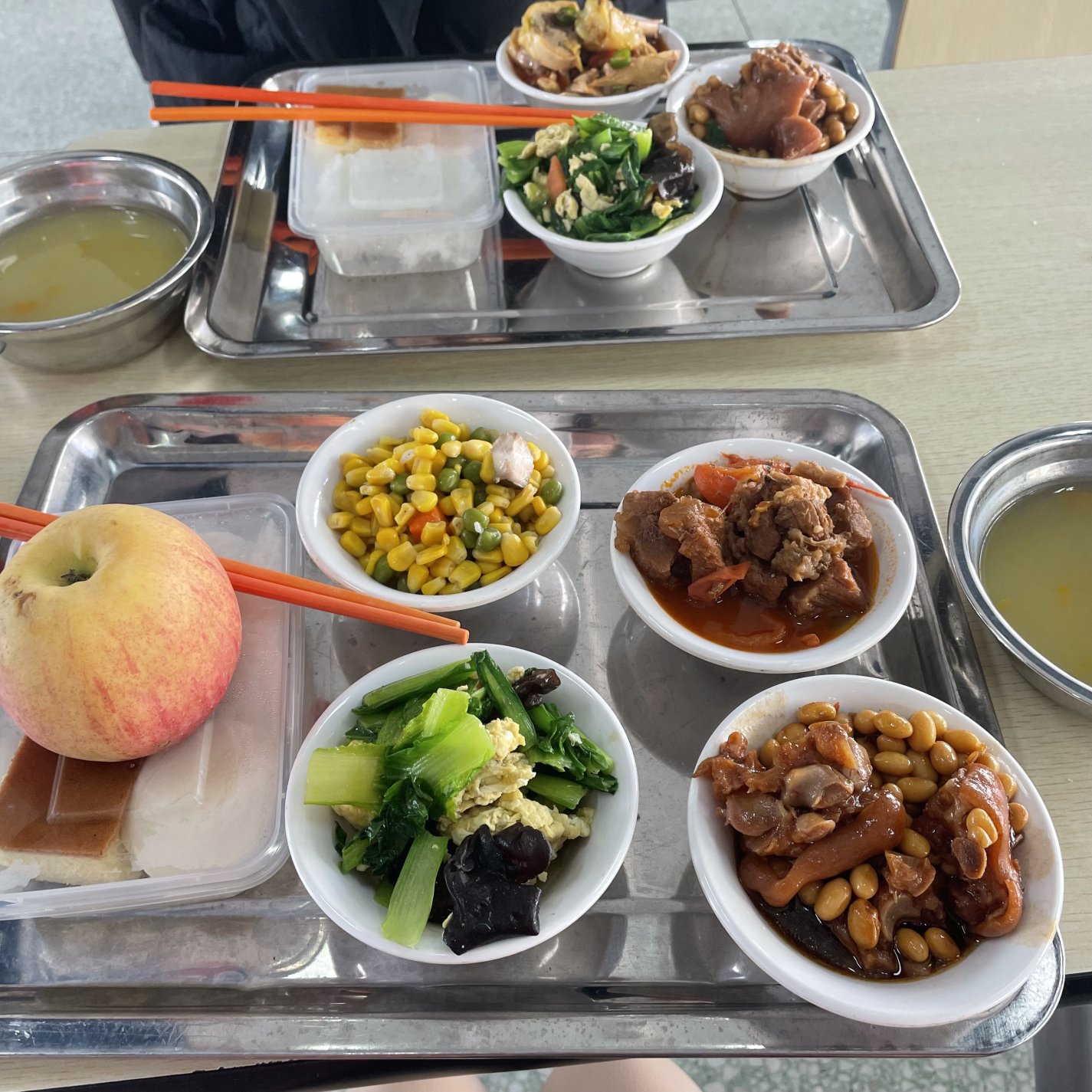 西紅柿牛腩、黃豆燒豬蹄、清炒玉米粒、油菜雞蛋,外加一個蘋果……大年三十當天,北京工商大學食品與健康學院研三學生金燕京在食堂享用了免費午飯和晚飯。