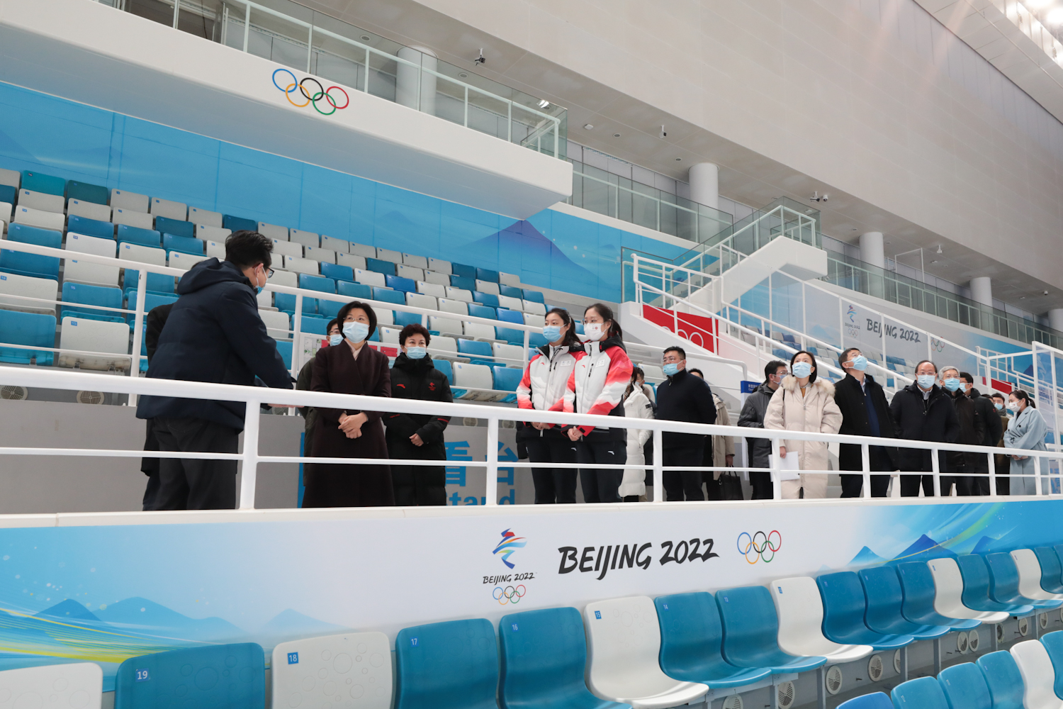 孫梅君部長(zhǎng)一行參觀了國(guó)家游泳中心比賽大廳,場(chǎng)館主任張杰從場(chǎng)館水冰轉(zhuǎn)換、志愿者基本情況和防疫三個(gè)方面做了重點(diǎn)介紹,孫梅君部長(zhǎng)與我校在現(xiàn)場(chǎng)服務(wù)的志愿者進(jìn)行了互動(dòng)。