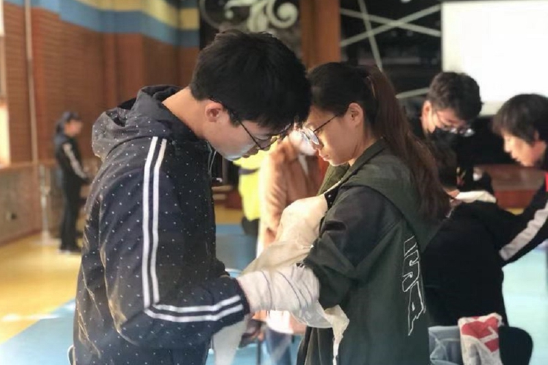 活動中,王志文老師簡要闡明了大學生掌握急救知識的重要性和必要性,詳細介紹了急救包內的用品及其用法,重點強調了三角巾、繃帶的使用方法。王老師為同學們講解了創傷的不同類型,有針對性地展示了螺旋包扎、八字包扎、頭部包扎、單胸包扎、全腹包扎、大懸臂帶、小懸臂帶等操作技巧,并帶領學生進行實操訓練,確保學習效果。
