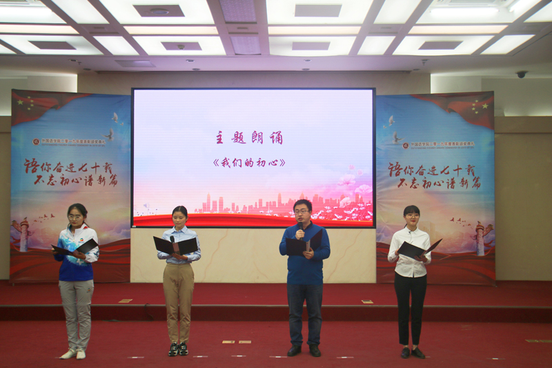 在表演環節中,情景表演《青春,為什么是紅色的》真實再現學院19名師生黨員參加國慶70周年群眾游行33號“從嚴治黨”方陣的點滴故事,以黨員的初心使命書寫無悔的紅色青春。舞蹈《芳華》以優美抒情的舞姿,向新中國不同時代的奮斗青春致敬。節目《我們的初心》以視頻采訪與師生朗誦的形式,通過英語、西語、法語、漢語等不同語言表達外語教師培育外語人才的初心,為國育才的使命,從學生黨員、志愿者、普通學生的視角講述每一個外語學子的初心故事。