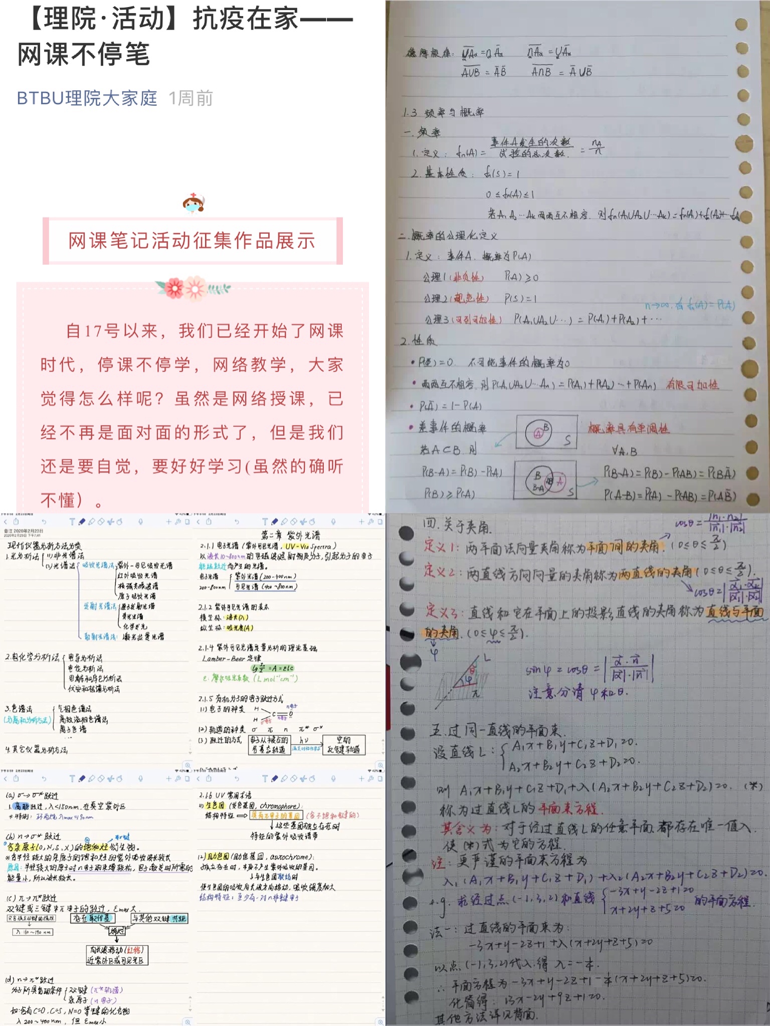 突發(fā)的疫情打亂了我們正常的學(xué)習(xí)和生活,宅家抗“疫”最終成了唯一的選擇。為落實(shí)學(xué)校“停課不停學(xué)”的要求,同時(shí)為同學(xué)們的宅家抗“疫”生活增添一些樂(lè)趣,學(xué)院開(kāi)展了“抗疫在家——網(wǎng)課不停筆”活動(dòng),將優(yōu)秀的筆記在學(xué)院微信公眾號(hào)上展出,激發(fā)同學(xué)們養(yǎng)成認(rèn)真、工整記筆記的良好學(xué)習(xí)習(xí)慣,同時(shí)可以使同學(xué)們互相交流學(xué)習(xí),促進(jìn)共同進(jìn)步。