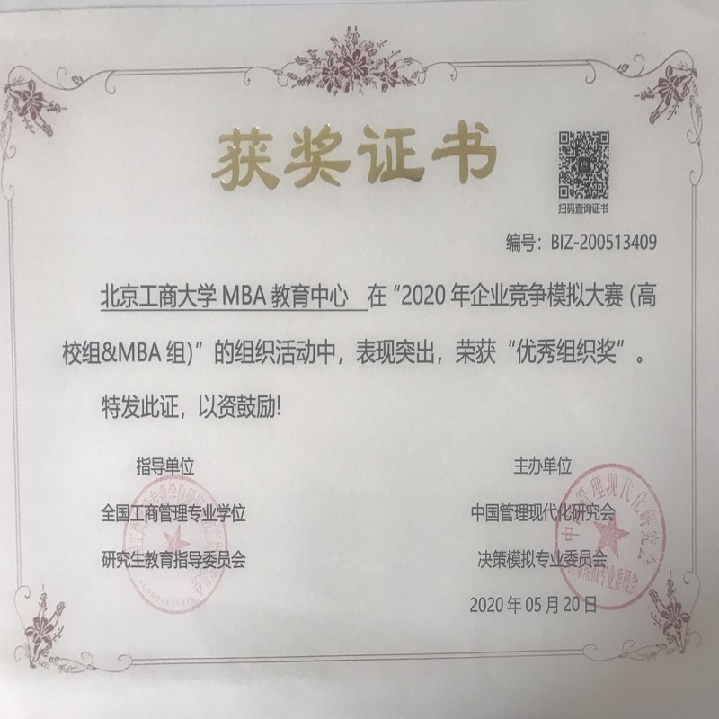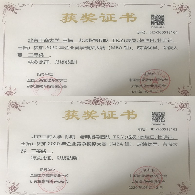 5月10日,2020年企業(yè)競(jìng)爭(zhēng)模擬大賽(高校組&MBA組)落幕,我校MBA教育中心七支MBA隊(duì)伍參賽,榮獲一個(gè)二等獎(jiǎng),兩個(gè)三等獎(jiǎng),指導(dǎo)教師王楠、孫碩榮獲優(yōu)秀指導(dǎo)獎(jiǎng),北京工商大學(xué)MBA教育中心榮獲優(yōu)秀組織獎(jiǎng)。