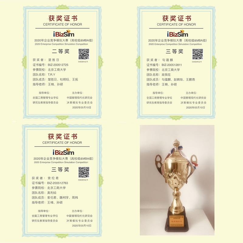 2020年企業(yè)競(jìng)爭(zhēng)模擬大賽(MBA組)由全國工商管理專業(yè)學(xué)位研究生教育指導(dǎo)委員會(huì)指導(dǎo),中國管理現(xiàn)代化研究會(huì)決策模擬專業(yè)委員會(huì)主辦,中國商業(yè)經(jīng)濟(jì)學(xué)會(huì)工商管理專業(yè)委員會(huì)協(xié)辦,目前已經(jīng)成功舉辦18屆。本屆比賽于3月份啟動(dòng),MBA組有效報(bào)名隊(duì)伍共計(jì)357支,其中中國參賽隊(duì)伍347支,來自全國25個(gè)省市自治區(qū)63所學(xué)校;尼泊爾參賽隊(duì)伍10支。經(jīng)過初賽、復(fù)賽、半決賽、總決賽四輪比賽進(jìn)行評(píng)獎(jiǎng)。此次比賽是我校MBA學(xué)子首次組織參賽,斬獲多項(xiàng)榮譽(yù),證明了我校MBA學(xué)子的實(shí)力。