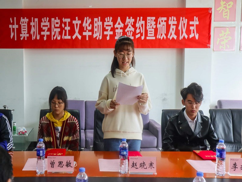 計算機類201班趙曉寒代表受助學生發(fā)言。趙曉寒向校友汪文華先生表達誠摯的謝意,并表示,校友設立助學金對同學們來說,不僅是物質(zhì)上的支持,更是精神上的給予,它讓受助學生感受到了社會和學校的溫暖。同時,趙曉寒也代表五位同學表示大學期間一定不辜負校友和老師們的期望,刻苦學習,珍惜每一次進步的機會,心存感激,立志成才,要向汪文華校友學習,將愛心不斷傳遞下去。
