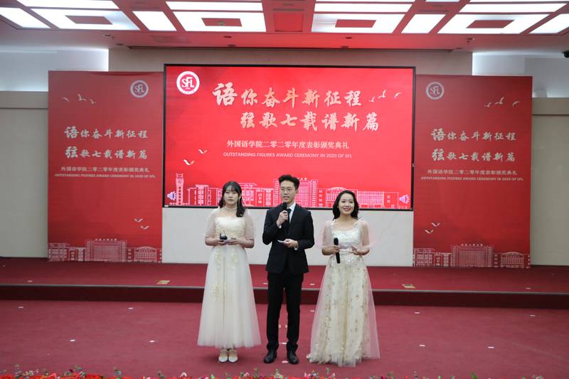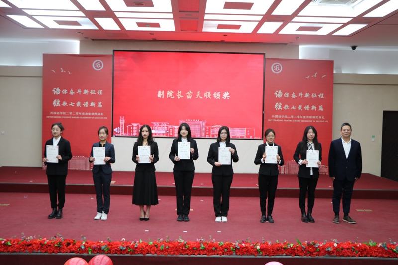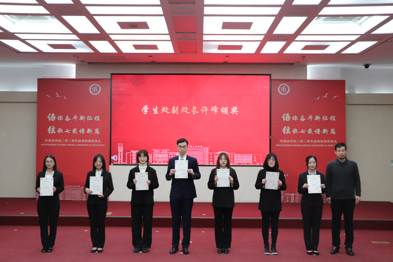 于濤宣讀《外國語學院2019-2020學年表彰決定》。在觀看優秀學生風采展示視頻后,許峰為國家獎學金、國家勵志獎學金、市級優秀基層組織、黨員先鋒等獎項頒獎。苗天順、關濤、史巖林、王曉慶、王景云分別為優秀學生獎學金、三好學生、優秀學生干部、校友獎學金、疫情防控優秀聯系人等獎項頒獎。