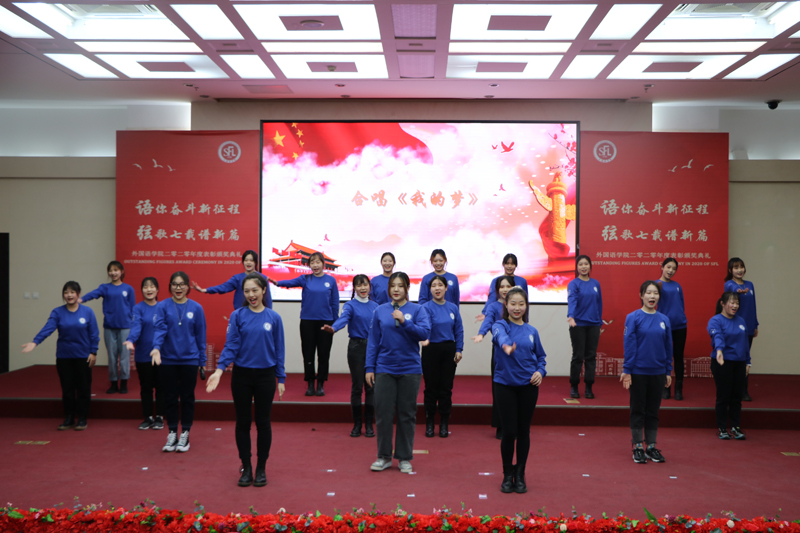 表演環節中,小品《疫情回國記》采用英語短劇的形式講述一位赴美留學生疫情期間歸國的曲折經歷,以生動地表演向我們展現莘莘學子熾熱的愛國情感,以及世界各國人民同心抗“疫”、構建人類命運共同體的力量。歌曲《我的夢》融入多元文化,外語合唱團精心編排,以動人的歌舞表達不畏艱難、勇于追夢的理想信念。
