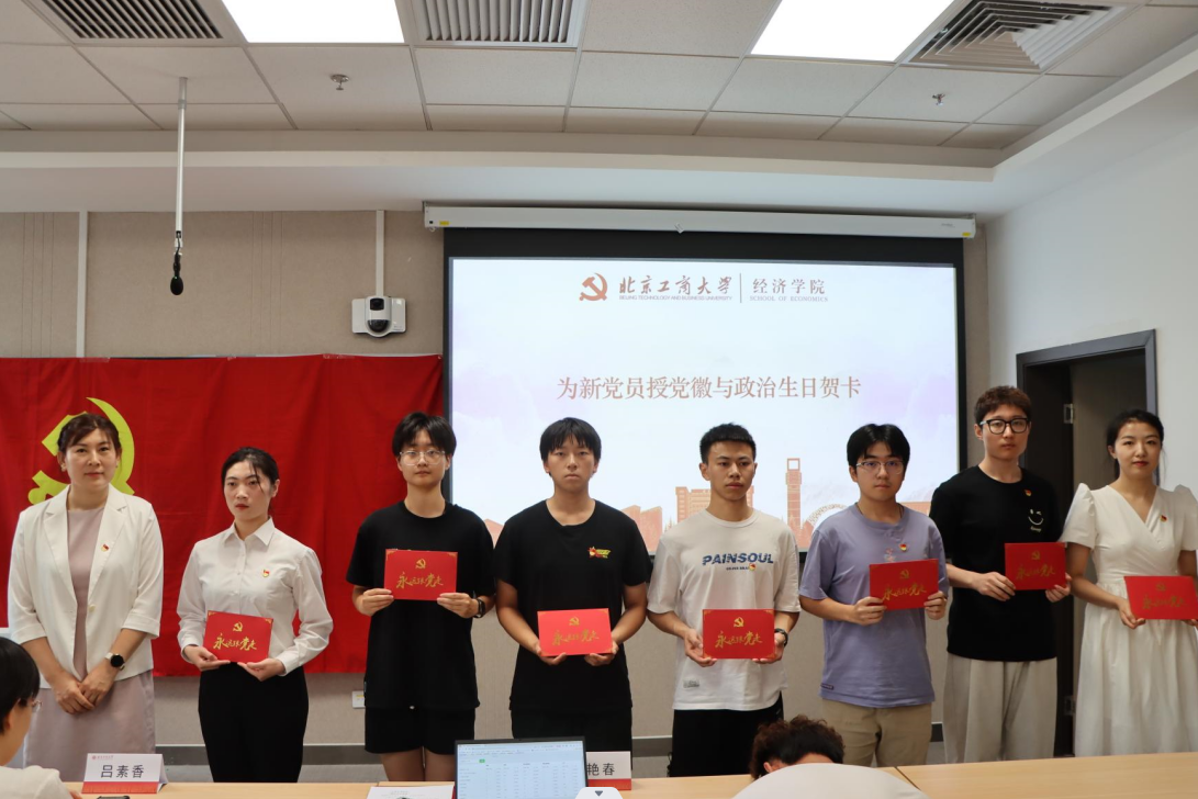 經(jīng)濟學院黨委副書記李艷春為新黨員代表授黨徽與政治生日賀卡。輔導員李錦為新黨員代表授主題教育學習讀本。