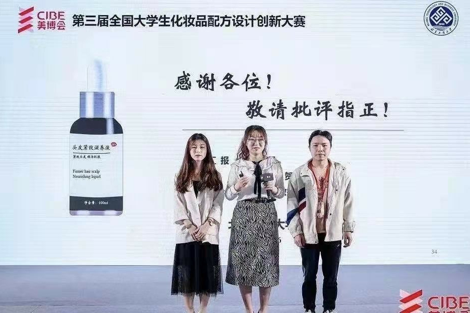 全國大學生化妝品配方設計創(chuàng)新大賽由中國國際美博會主辦,本次大賽共收到了來自全國近14所高校的41項作品,經(jīng)過緊張而激烈的海選及初選環(huán)節(jié),共有12項作品最終進入決賽。我校馬宇晨、丁文玉、賀建彪團隊作品《SFN頭皮緊致滋養(yǎng)液》,及趙鑫飛、路婉杉、邱靜團隊的作品《火龍果根提取物護膚三件套》兩項作品在決賽中,經(jīng)“PPT路演展示”、“現(xiàn)場答辯”環(huán)節(jié),獲得評委一致好評,并最終分獲大賽二等獎和三等獎。