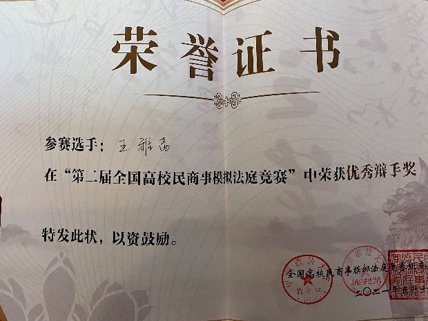 5月8-10日,第二屆全國高校民商事模擬法庭競賽在中國政法大學舉行,學校法學院首次組隊參賽。隊員王雅茜榮獲優秀辯手獎。