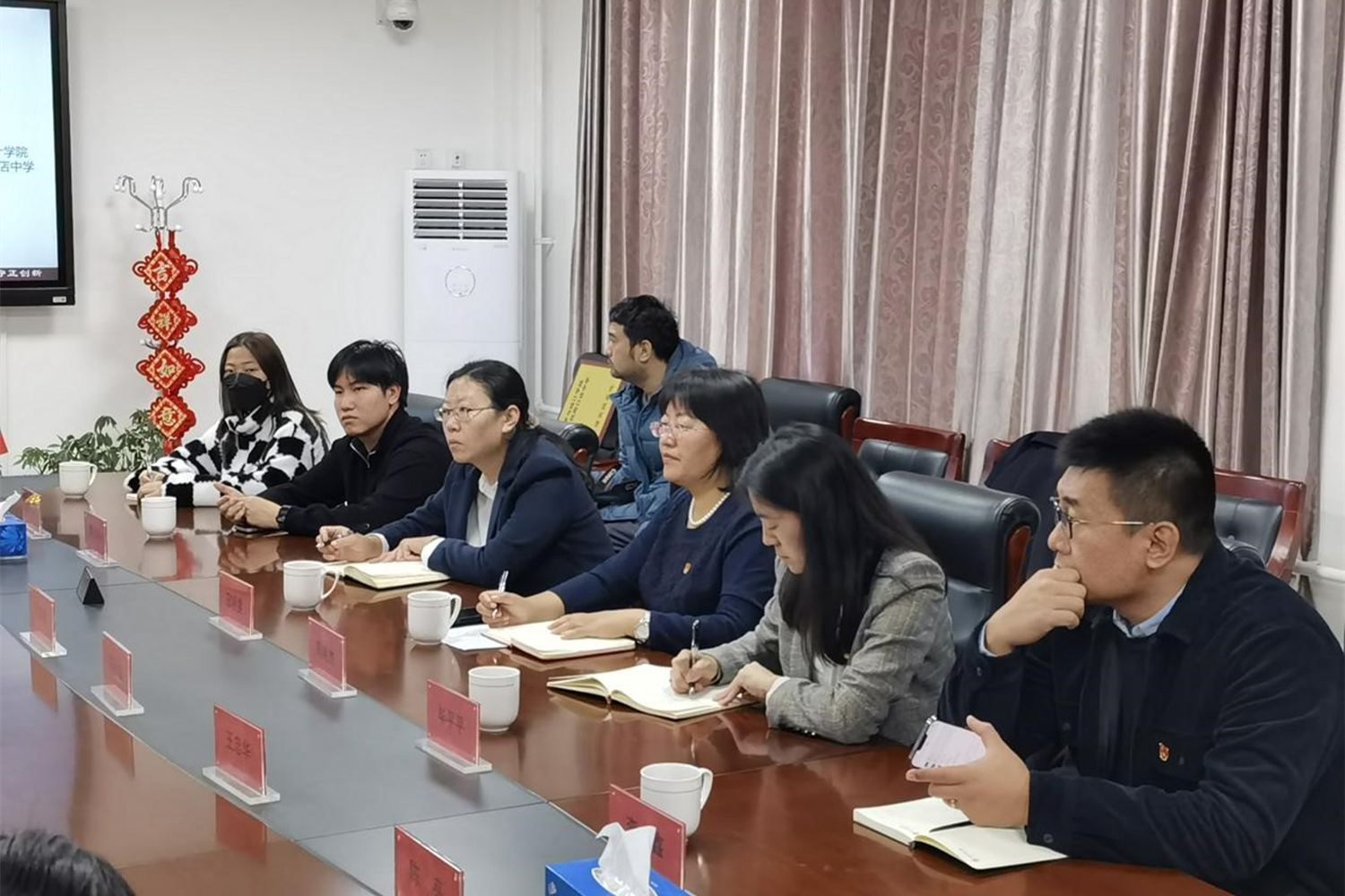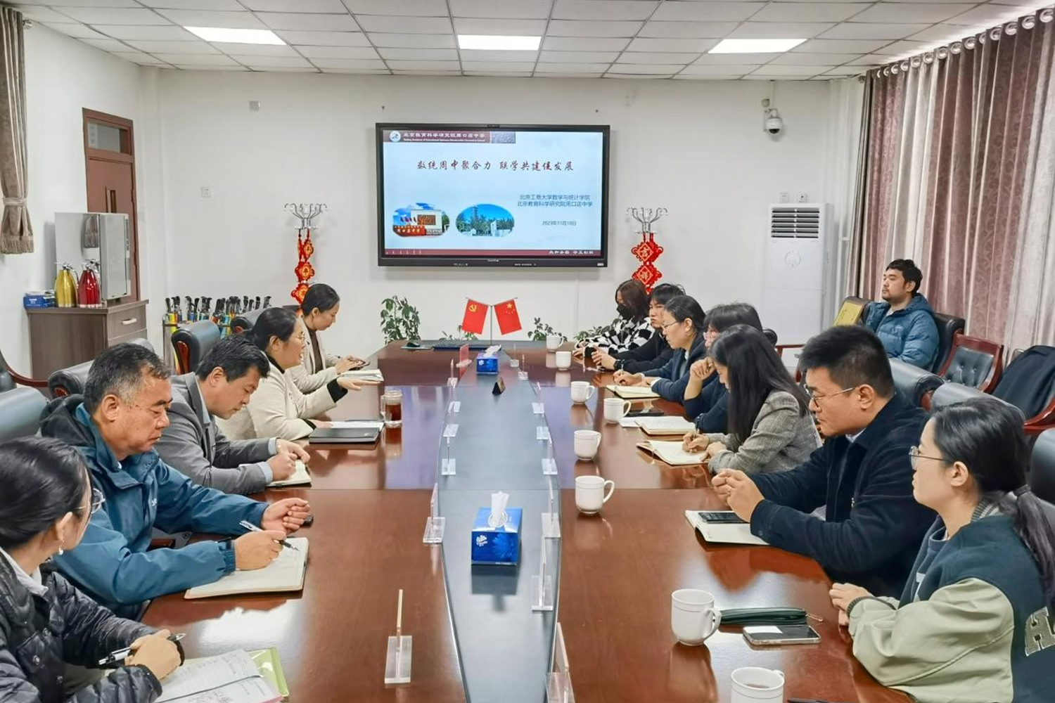 周口店中學(xué)校長(zhǎng)、周口店中學(xué)黨支部書記符金枝,德育副校長(zhǎng)于春普,教學(xué)副校長(zhǎng)賁鎏,周口店中學(xué)黨支部副書記王忠華,總務(wù)處主任蘆紅亮,教學(xué)處主任曾超以及德育主任陳亮代表周口店中學(xué)參加會(huì)議。數(shù)學(xué)與統(tǒng)計(jì)學(xué)院黨委書記周艷杰,黨委副書記畢平平,專職組織員,團(tuán)委書記,輔導(dǎo)員以及部分學(xué)生骨干參加了會(huì)議。