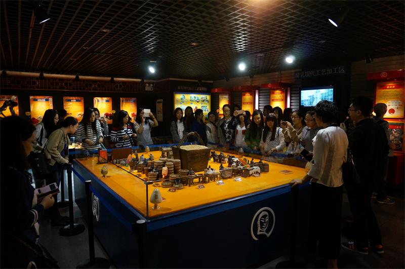 同學們依腐乳的生產工藝流程參觀了腐乳的豆腐打胚、前期發酵、裝罐、浸汁等生產線,并在參觀中不斷提出加工制造專業問題,還見到并觸摸了長滿菌絲的腐乳半成品,了解了部分腐乳手工制作的技巧,整個參觀過程同學們認真投入。同學們又參觀了王致和的廠史博物館。