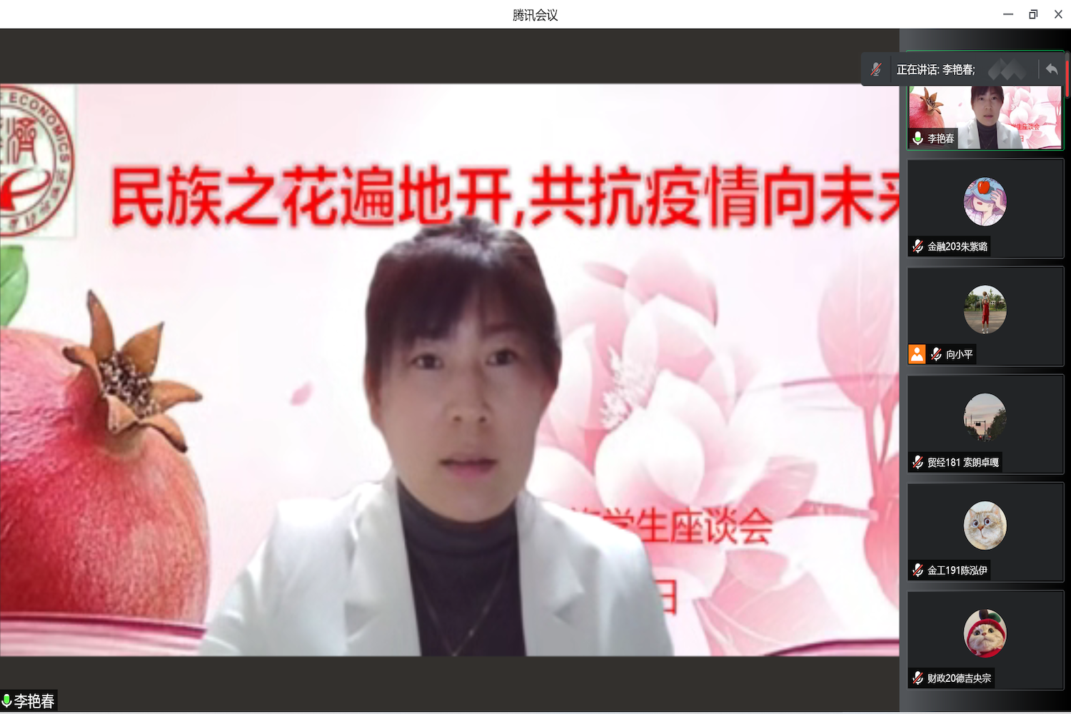 經貿211班 再依努爾.依米提、財政20班李美琪、經貿213班劉璐雪、金融217班羅爔作為少數民族學生代表發言,他們圍繞學習、生活、心理等方面分享了自己的經驗,同時也就疫情期間居家學習和防控措施等問題進行了交流。學生代表們紛紛表示在疫情居家學習期間,學院給予了許多關愛和支持,同時也對疫情期間的學校管理表示充分的理解和認可。他們表示,在居家學習時,一定要保持規律的作息時間,提高學習效率。作為新時代青年,在疫情防控的關鍵時刻,要有青春擔當,主動遵守當地的疫情防控要求,用實際行動回報師長、回報學校、回報社會,希望不久的將來能在春暖花開的校園再次相遇。