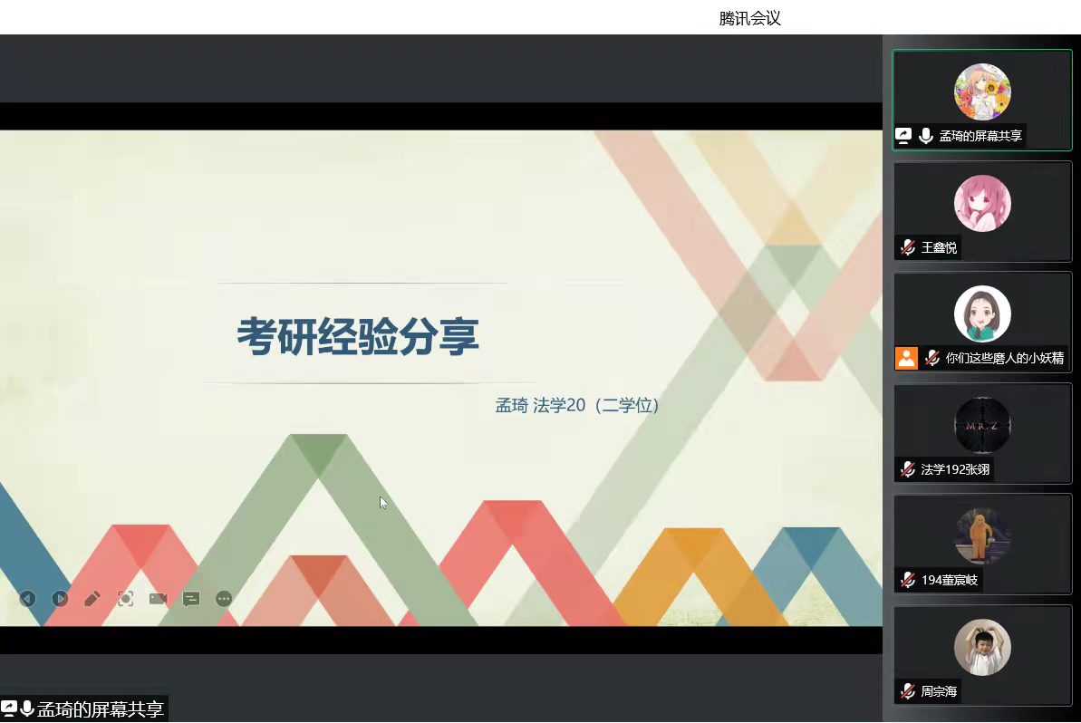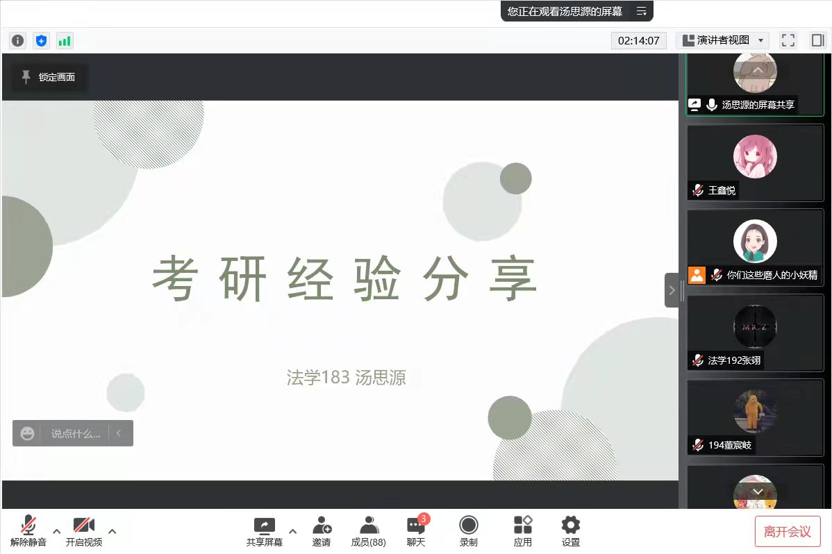 在2018級考研上岸學生經驗分享環節,孟琦、湯思源和林廷霄分別介紹了各自備考的經驗。他們從考研流程、考研心態、學習規劃、學習方法、復試經歷和資料推薦等方面進行細致講解,并耐心解答了同學們的問題,鼓勵同學們找到自己的復習模式,找方法補短板,合理分配好復習時間,做好復習規劃。