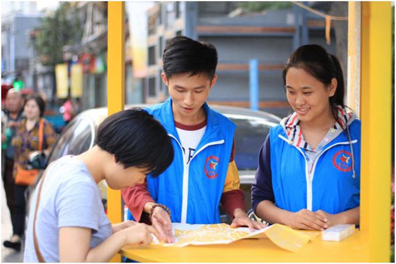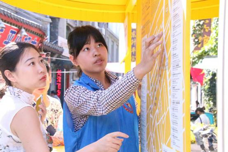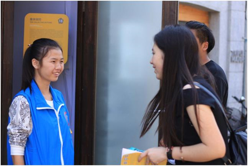 打開志愿者之家的門,換好藍色的志愿馬甲,佩戴好設計周袖標,負責人分配好每個人的崗位,一天的志愿生活就此開始。忙碌的志愿者們不論風雨、不論疲乏,沒有沮喪的聲音也沒有失望的面孔,用熱情與微笑對待每一位游人。志愿服務就像一堂社會課,面對不同游客的態度與問題,志愿者們學會了換位理解與多角度思考,角色轉換之間他們懂得了真正的尊重。
