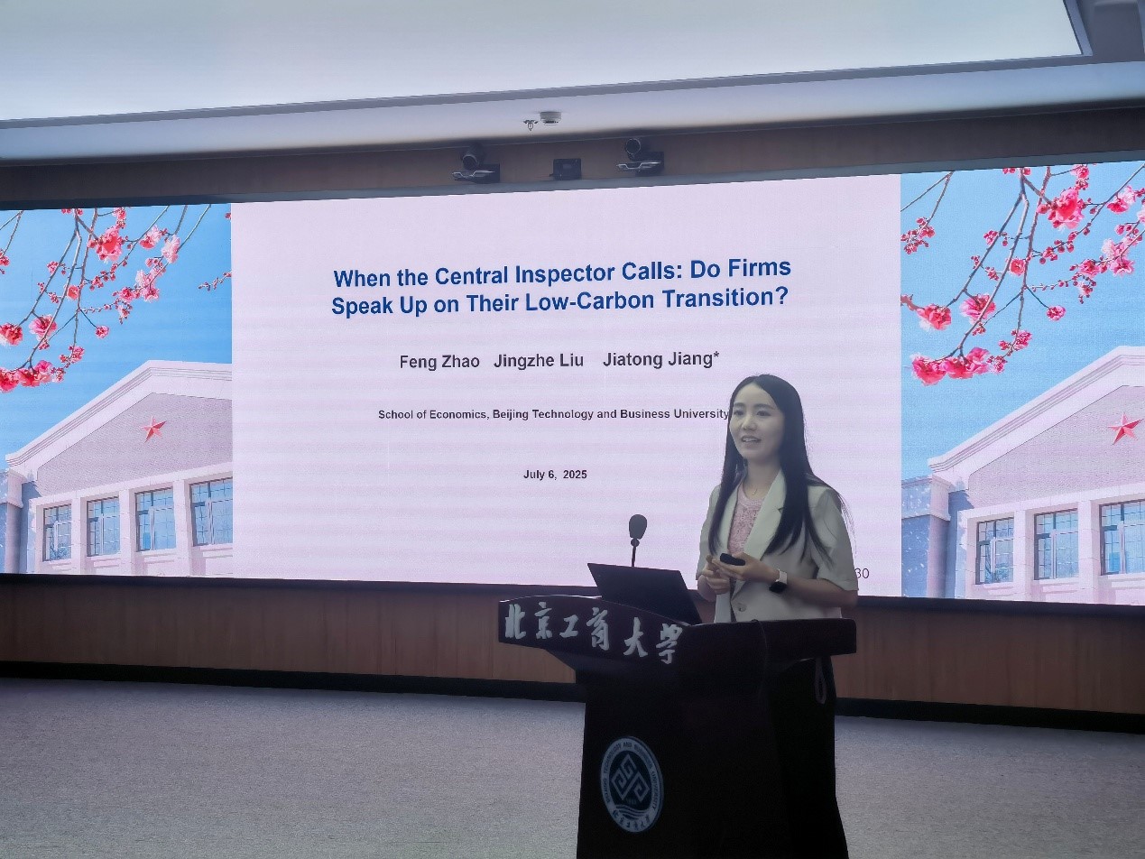 北京工商大學經濟學院教師姜佳彤報告論文“When the Central Inspector Calls: Do Firms Speak Up on Their Low-Carbon Transition?”,文章創新性地構建了企業層面的低碳轉型信息披露指數,研究中央環保督察對企業低碳轉型的影響。研究發現,相較于清潔型企業,環保督察制度(CEPI)的實施,顯著提升了重污染企業的低碳轉型信息披露水平。該效應在國有企業、無環保背景高管領導的企業及數字化轉型程度較高的企業中尤為顯著。