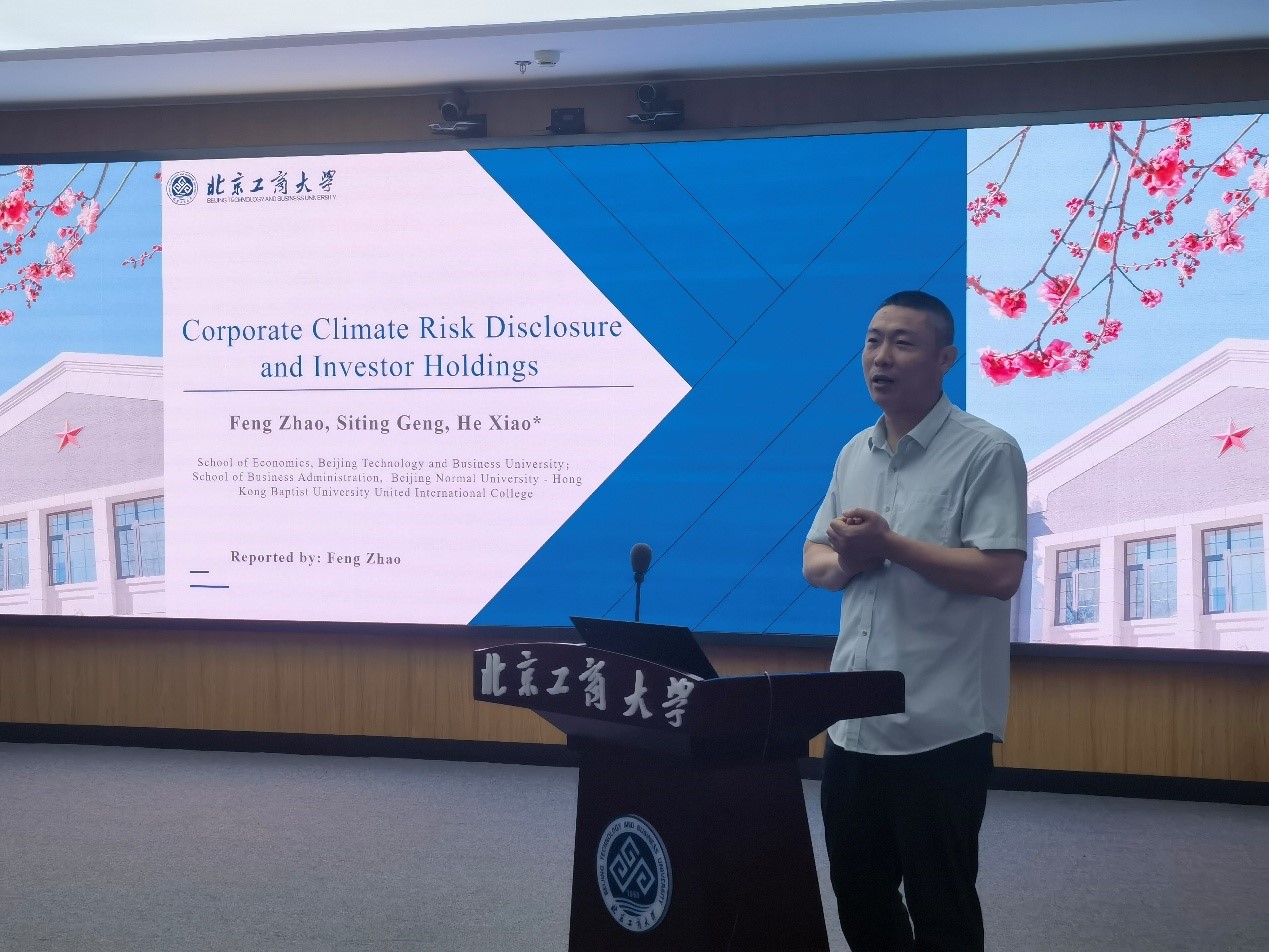 北京工商大學經濟學院教授趙峰報告工作論文“Corporate Climate Change Exposure Disclosure and Institutional Investor’s Share Holdings”,文章利用文本分析法和機器學習方法創新性地構建了企業層面的氣候風險披露指標,實證研究了企業氣候風險披露對機構投資者持股的影響。研究發現,氣候風險信息披露通過降低股價崩盤風險、改善股票市場表現及提升企業聲譽,顯著提升了中國市場中機構投資者的持股比例。