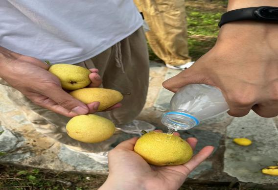 實踐團在村委會的帶領(lǐng)下參觀梨園,深入實地了解梨的品種、形態(tài)、功效等。賈河村的梨品種繁多,主要為白梨、子母梨和廣梨三個品種,其中白梨口感最為香甜,子母梨口感酸中帶甜,廣梨口感較面,三者均具有清熱潤肺的功效。