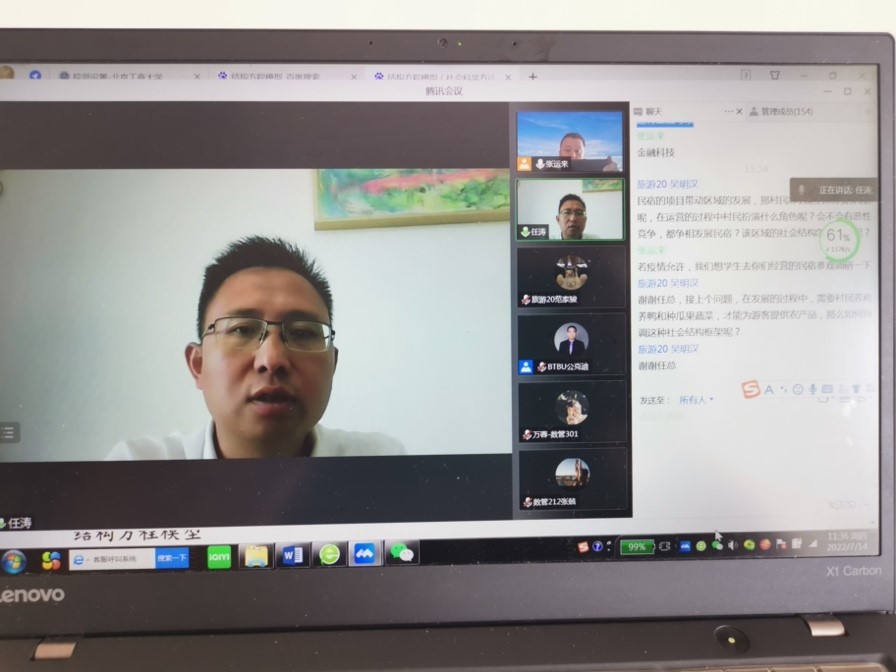 在旅游管理系列講座的過程中,專家們與學生進行了充分的交流與互動。張俊剛的講座內容引起了在場師生的高度關注與興趣,也引發了熱烈討論,同學們紛紛表示獲益匪淺,更加明確了“數智旅游”的技術支持手段和實踐應用領域。劉謝慧以旅游業為例跟同學們進行深入交流,旅游與同學們的學習生活息息相關,從旅游業出發進行案例討論,引起同學們的共鳴,切實感受到市場調查對行業分析的具體作用。任濤通過啟發式教學,引發學生們廣泛提問,任濤耐心解答了同學們的諸多問題,如在民宿運營的過程中村民扮演什么角色,是否存在惡性競爭,如何發展旅游農產品等問題,并表示疫情結束后課增加線下互動,帶領學生們進行民宿實地調研。這次課程,拓寬了學生對鄉村民宿業的理解,為學生們日后加入鄉村振興事業埋下了種子。