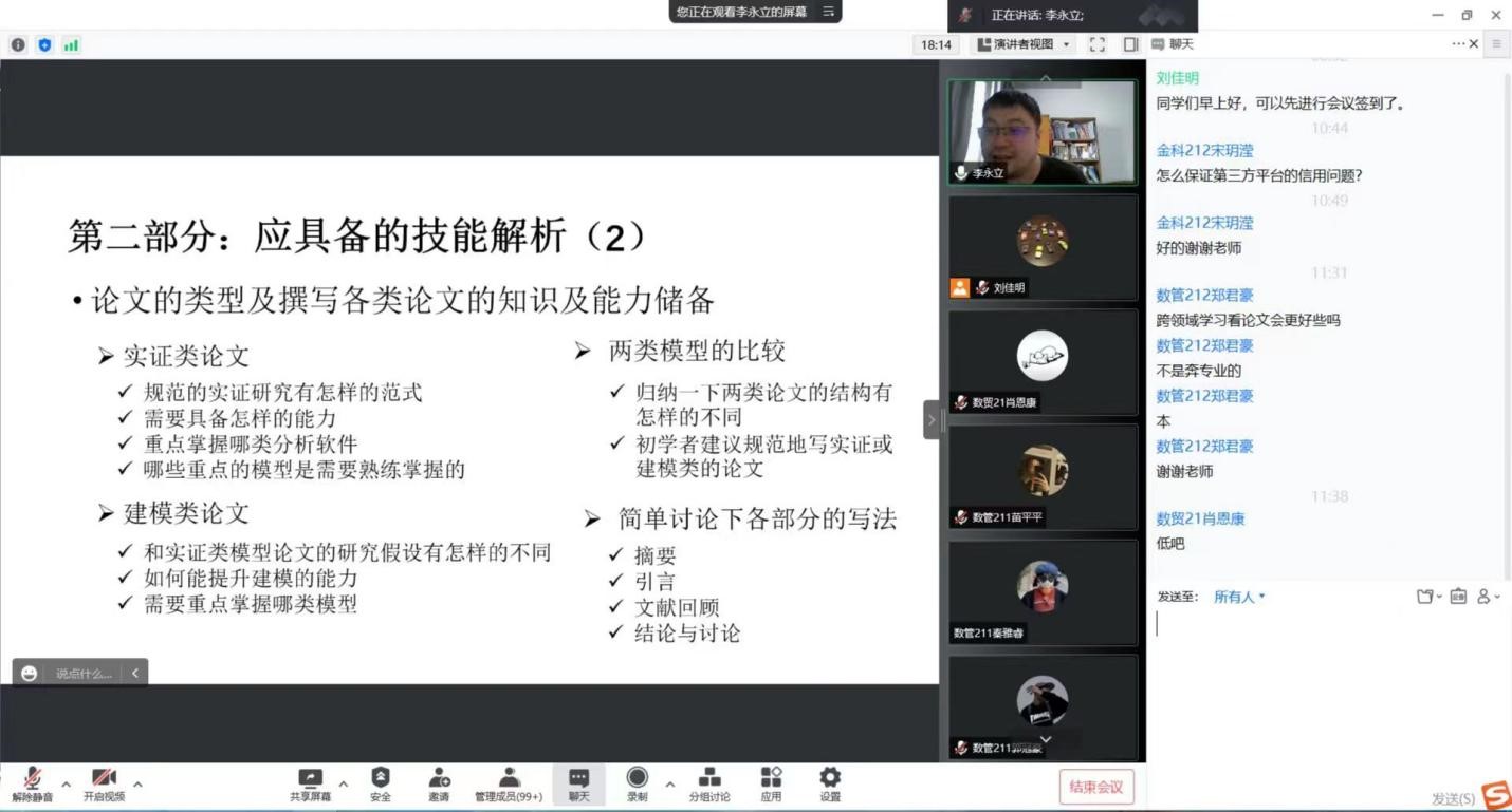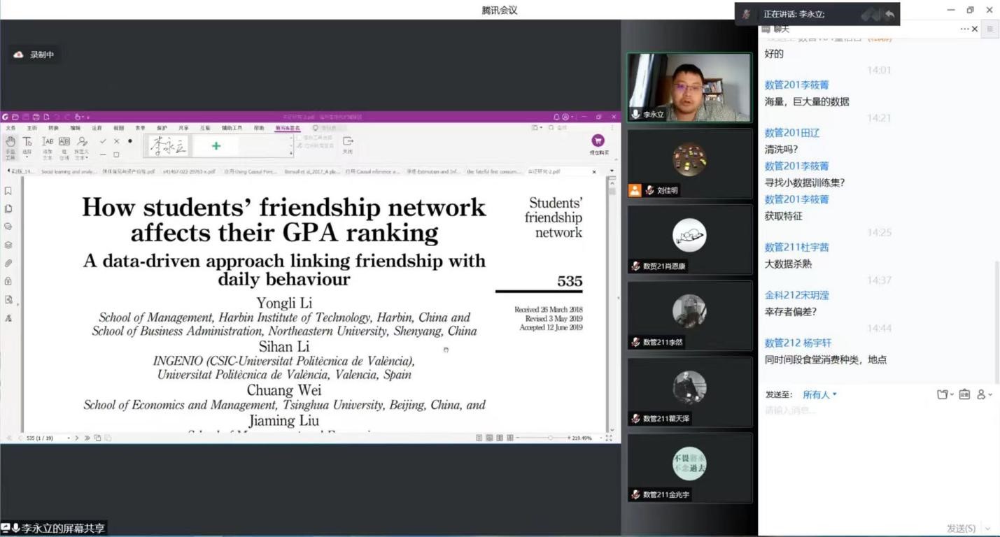 在《社會網絡分析及應用》的專題講座中,李永立教授首先介紹了什么是科研,如何做科研,以及本科生同學如何參與到科研工作之中。李永立教授結合自己的科學研究方向-社會網絡分析,詳細介紹了兩篇代表性論文的研究問題、研究過程以及研究內容,為各位同學今后開展科研任務提供了非常有借鑒意義的參考。同學們就科研工作的開展、學習生活的安排等內容進行了深入的交流。