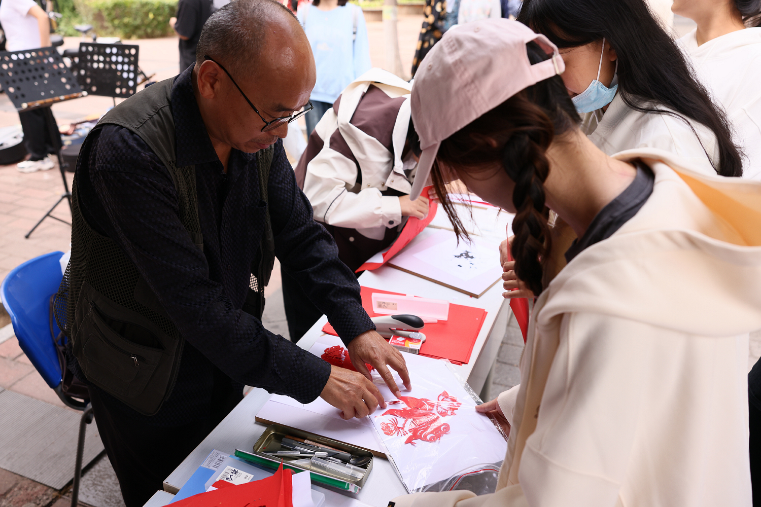 民族文化展覽體驗區,同學們體驗形式多樣的民族特色活動。展品區,同學們試戴精美的民族特色帽子拍照打卡留念。文化區,體驗毛筆書法,藏文書法和剪紙,感受悠久燦爛的中華民族文化。游戲區,同學們在體驗中學習,在交流中交融,編織了北工商一幅幅手足相親的民族團結畫卷。