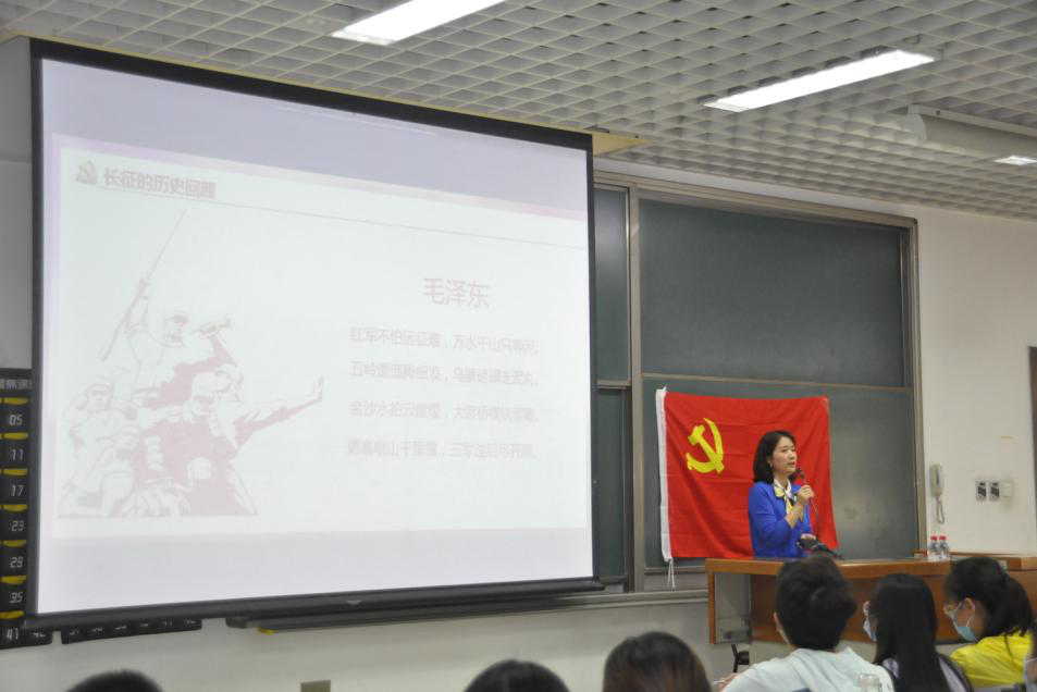 張春萍從長征的歷史回顧、長征精神的內涵和意義、如何傳承長征精神三方面與學生黨員進行了講解和交流。她首先強調了學習黨史的重要性,引用了習近平在黨史學習教育動員大會上的講話中關于“進一步發揚革命精神,始終保持艱苦奮斗的昂揚精神”的要求,強調了學習和傳承共產黨人精神譜系的重要意義。隨后,師生以共同朗誦毛主席的《七律·長征》拉開序幕,追溯長征崢嶸歲月。張春萍講解了長征中的重大事件、克服的困難和取得的成績,提煉出偉大的長征精神,并闡述了長征精神的深刻內涵和偉大意義。