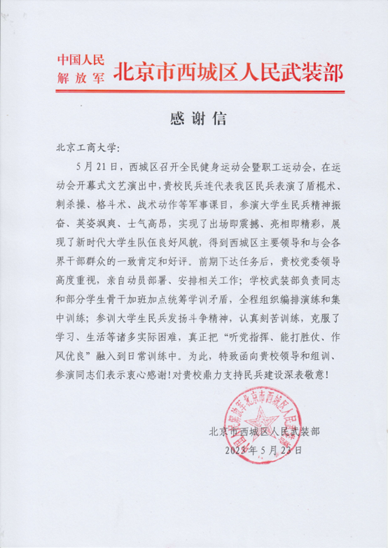 5月21日,北京市西城區全民健身運動會在月壇體育中心隆重舉行。在開幕式文藝演出環節,我校大學生民兵連代表西城區武裝部民兵組織表演軍事科目《民兵風采》燃爆全場。西城區領導給予高度評價,西城區武裝部給學校發來感謝信。