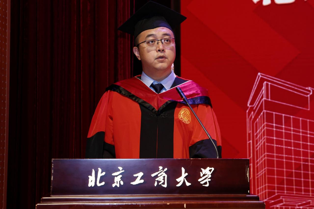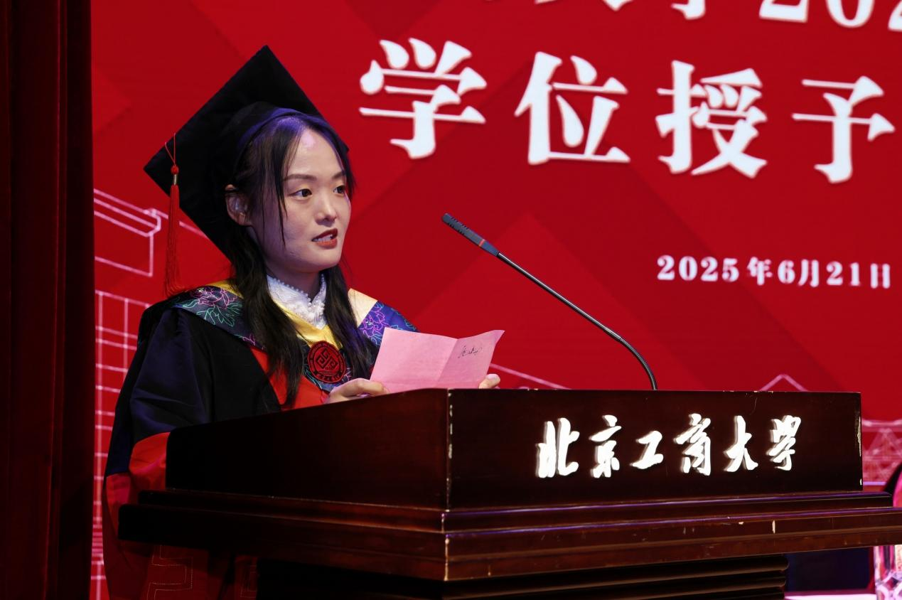 教師代表李赫教授發言。他談到,教育是彼此映照、彼此成就的生命旅程,教師最大的幸福在于見證學生的成長與蛻變,對畢業生們在疫情反復中堅守學習、在科研攻關中勇于探索的精神給予了高度評價。畢業生不僅為服務國家食品安全與健康中國戰略貢獻了青春力量,還積極推動了學校食品學科“雙一流”建設的穩步前行。2024年食品學子勇奪全國挑戰杯揭榜掛帥專項賽特等獎擂主,刷新了學校的歷史紀錄。2025年我校在U.S.News全球最佳院校排名中再創新高,食品科學與技術躍居全球第9,農業科學提升至第12位,這些成就的背后,離不開每一位學子的辛勤付出與不懈努力。他勉勵畢業生珍視求學過程中風雨同舟的伙伴,堅持敢于突破的勇氣,激發思維碰撞的智慧,希望畢業生們弘揚學校“工商一體化”的理念,牢記學?!肮ひ蚤_物,商以富邦”的宗旨,勇敢面對未來的廣闊與未知,祝愿畢業生“心中有光,不懼路長,腳下有力,行穩致遠”。