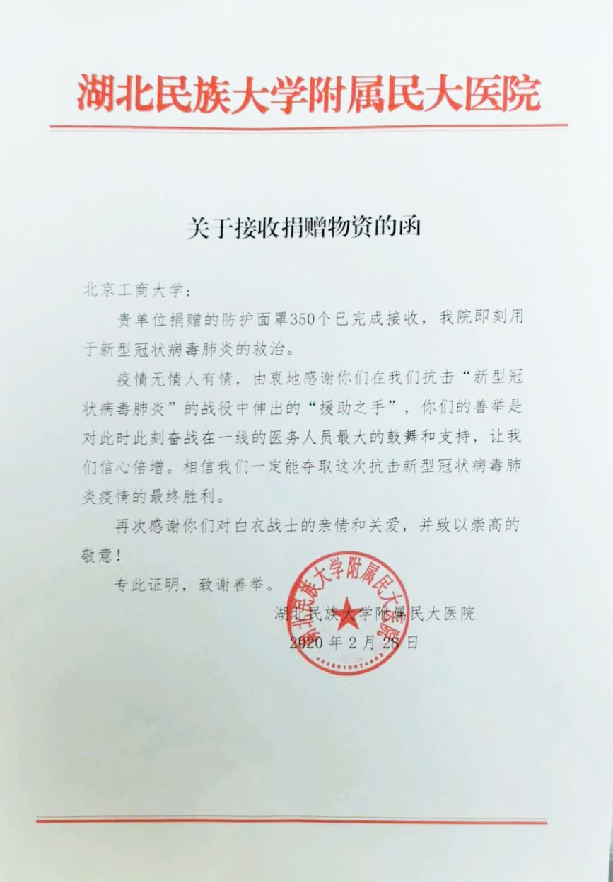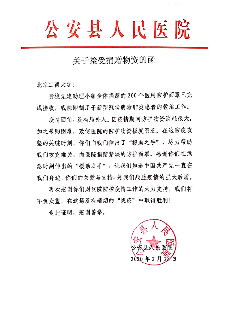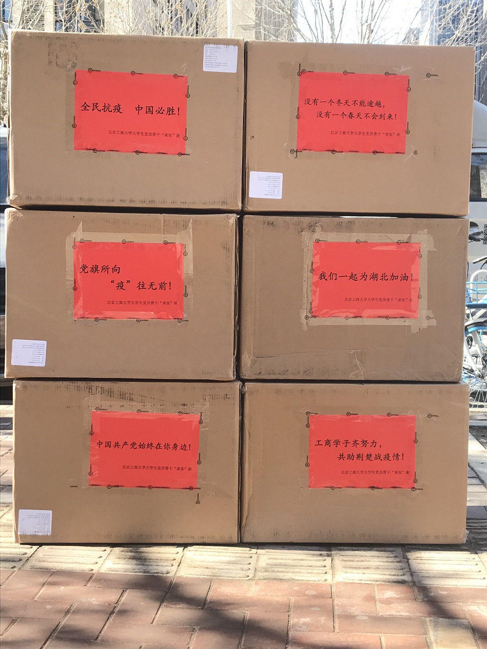 “中國共產黨始終在你身邊!”“工商學子齊努力,共助荊楚戰疫情!”“黨旗所向 疫往無前”“與國同心 共克時艱一句句帶著黨徽光芒,帶著北工商青年大學生愛國溫度的祝福語伴隨著物資直抵湖北一線。湖北荊州市公安縣人民醫院的領導表示看到這樣充滿正能量的加油標語,感受到了北京工商大學黨員同學同志式的關心,也給一線醫務工作者增添了信心和力量!對參與此次募捐活動的黨員同學表示衷心的感謝!對北京工商大學表示由衷的敬意!恩施土家族自治州湖北民族大學附屬民大醫院專程發來的接收函中表示你們的善舉是對此時此刻奮戰在一線的醫務人員最大的鼓舞和支持,讓我們信心倍增。感謝你們對白衣戰士的親情和關愛,并致以崇高的敬意!”