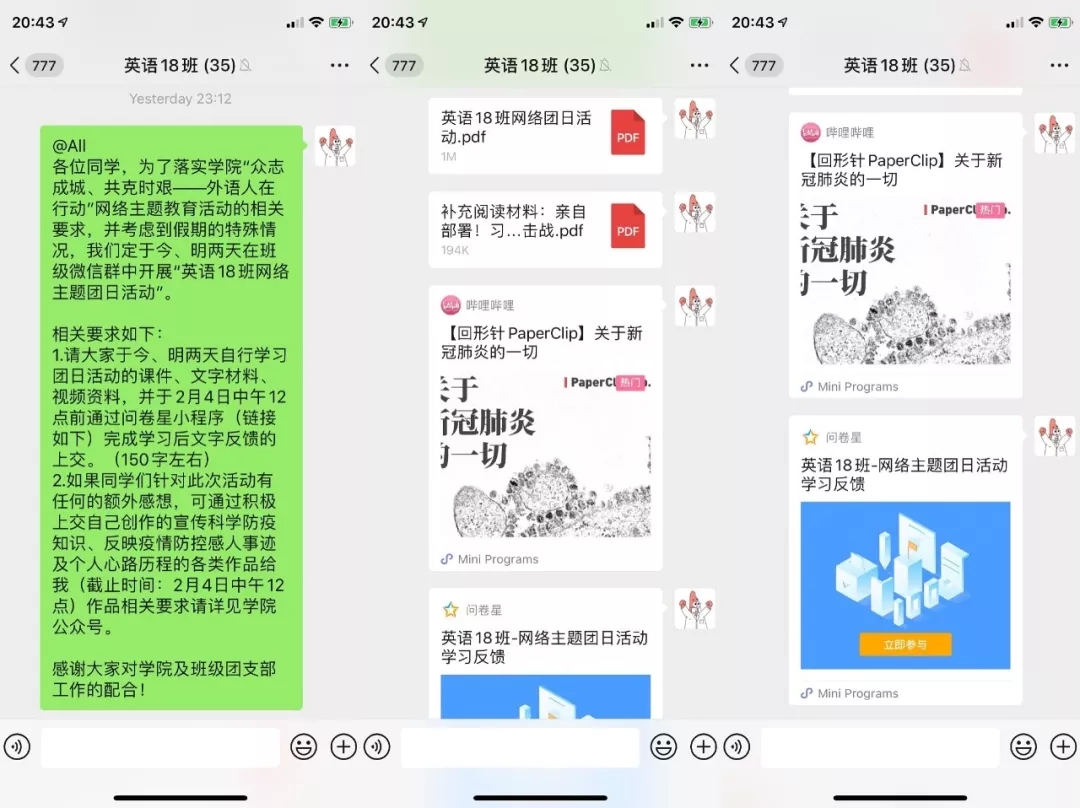 在新冠肺炎疫情防控工作的關鍵時期,黨有號召,團有行動,為深入學習貫徹落實習近平總書記重要指示和黨中央、國務院決策部署,按照學校疫情防控工作統一部署,校團委組織開展了“抗擊疫情,共渡難關”線上戰疫“云團日”活動,要求各級共青團組織和廣大團員青年、團干部立即行動起來,提高政治站位,強化責任擔當,發揮基層團組織的戰斗堡壘作用和團員青年的先鋒模范作用。 學院各團支部高度重視,積極響應和開展“云團日”活動,向廣大團員青年發出倡議,服從學校統一安排部署,顧大局聽安排,以積極的心態和健康的生活方式迎接這場沒有硝煙的戰爭,體現新時代團員青年的擔當與使命。各團支部活動內容與形式豐富多樣,采取線上學習、線上交流討論等方式,結合專業知識、個人興趣愛好和對疫情防控的所獲所感等進行深入探討,同時充分運用多種新媒體平臺,對國家、北京市、我校相關政策和法律法規進行宣傳,傳播和宣揚正能量,引導積極防疫,科學戰疫。 理學院 理學院師生積極參與,推出了新媒體作品、藝術設計、視頻等。作品中深切表達了對疫情防控的一線工作者的敬意與支持,對疫情勝利充滿信心的正能量。同時為緩解同學們因疫情帶來的一些負面情緒,理學院的微信平臺借助網絡推送進行集體心理疏導,以促進同學們良好心態的建立,積極心理狀態的保持。 數學與統計學院 數學與統計學院數學172班團支部在班群里發送了《關于新冠狀病毒的一切》的科普視頻,讓大家充分了解病毒的生存機制,傳播途徑并學習有效的防治措施。同時學院號召全體團員以文字、視頻、宣傳畫等形式,記錄當下在家的學習生活動態、聲援武漢和致敬白衣天使,并征集最美戰“疫”者新聞素材,同學們紛紛表達了對武漢的祝福與鼓勵,對抗“疫”一線醫護人員的感激和敬仰之情,也分享了同學在家鄉為防疫工作中所做出的貢獻。統計182團支部以“武漢加油,中國加油”為主題,通過書畫等形式積極參與此次團日活動,使所有團員團結在一起,擰成一股繩,為武漢加油,為中國加油。 食品與健康學院 食品與健康學院的同學們熱情積極,創作了不同形式的作品來為武漢加油。同學們錄制了加油視頻,一句句加油的吶喊,一聲聲殷切的期盼,都表達了同學們熱忱的內心。學子們制作了“點亮地圖,為武漢加油”的海報,在祖國各地的同學們,手繪了畫報,為自己的家鄉加油,為武漢加油。朱唯嘉和張晉華用顏料與畫筆描繪真情,以自己擅長的方式支持祖國。通過開展“抗擊疫情,共渡難關”主題團日活動,同學們加強了對官方網站和媒體平臺防控動態、防疫知識的學習。 輕工科學技術學院 輕工科學技術學院用刺繡、海報、手抄報、書法、散文、詩歌等作品“為武漢加油,為中國加油”。環境181班阿月爾古力用代表健康,生命的綠線編織出“武漢加油這一刺繡作品”,愿武漢能夠克服疾病,帶來希望;愿中國挺過難關,帶來安康。通過這次活動,各團支部團員對疫情都有了正確的認識,明白身為一名大學生、一名團員應該負有的時代責任:國家有難,我們輕工人是黑夜的一束光,螢火匯星河,為患者和前線人員守望,為疫情斗爭的勝利做出應有的貢獻。 材料與機械工程學院 材料與機械工程學院積極投入抗“疫”宣傳工作,召集莘莘學子舉辦了關于抗擊疫情的主題團日。各班通過線上班會的形式討論了這次疫情帶來的感受。在各個班級積極匯總上傳的思想報告之中,材料172班的同學用倡議書的形式來呼吁大家團結一心,包裝18編寫調查問卷組織同學學習防疫理論等,在討論之余,材機學院的同學們也紛紛說出了想對一線抗疫奮戰的醫護人員和武漢全體市民說的話:“祝你們一切順利,早日凱旋。”“武漢加油,我們等你!” 計算機與信息工程學院 計算機與信息工程學院團委通過分組討論,視頻,趣味測試等方式,向團員們傳達科學的防疫觀念,要求團員們明確自己在關鍵時刻的責任,同時起到調節團員心態的積極作用。團支部號召每位團員,寫下自己對武漢,對湖北,對整個中國最想說的話,并將其拼成圖片,錄成視頻。團員們也各展其才,通過繪畫、海報設計、書法等方式,向身在一線的白衣天使表達了崇高的敬意。每一份成果都滿載著計信學子的愛與希望。 經濟學院 經濟學院保險19團支部邀請了班里的兩位同學與大家分享了他們假期的生活,讓同學們向他們學習,在家中堅持健康第一,多鍛煉,多讀書,為新學期做好準備!貿經192團支部一起錄制了《堅信愛會贏》視頻,7名同學用歌聲傳遞對疫情勝利的必勝信心。視頻完成后,收集班級同學對疫情的感想,并在班級公眾號進行推送,讓同學們為武漢加油。 商學院 商學院的同學們共同制作了鄉音應援合集,志愿者部錄制了加油視頻,大家透過鏡頭,吶喊著祖國加油,武漢加油,一張張堅毅的面孔,一句句鏗鏘有力的吶喊,都表露了他們最真摯的內心,用鄉音表達對祖國同胞的祝愿,堅定地與他們并肩作戰。商學院還制作了相關海報來參與本次抗擊疫情團日活動。會計173班用飽滿的歌聲作為依托,用一段段視頻匯聚真情,表達了對祖國的關切和對所有抗擊在疫情一線的工作者的敬佩。張晴選擇用畫筆表達祝愿,關世統選擇用筆墨書寫真情,他們都在以不同的方式默默地支持著祖國。 法學院 法學院舉辦了新穎有趣的疫情知識競賽;通過觀看抗擊疫情的視頻
