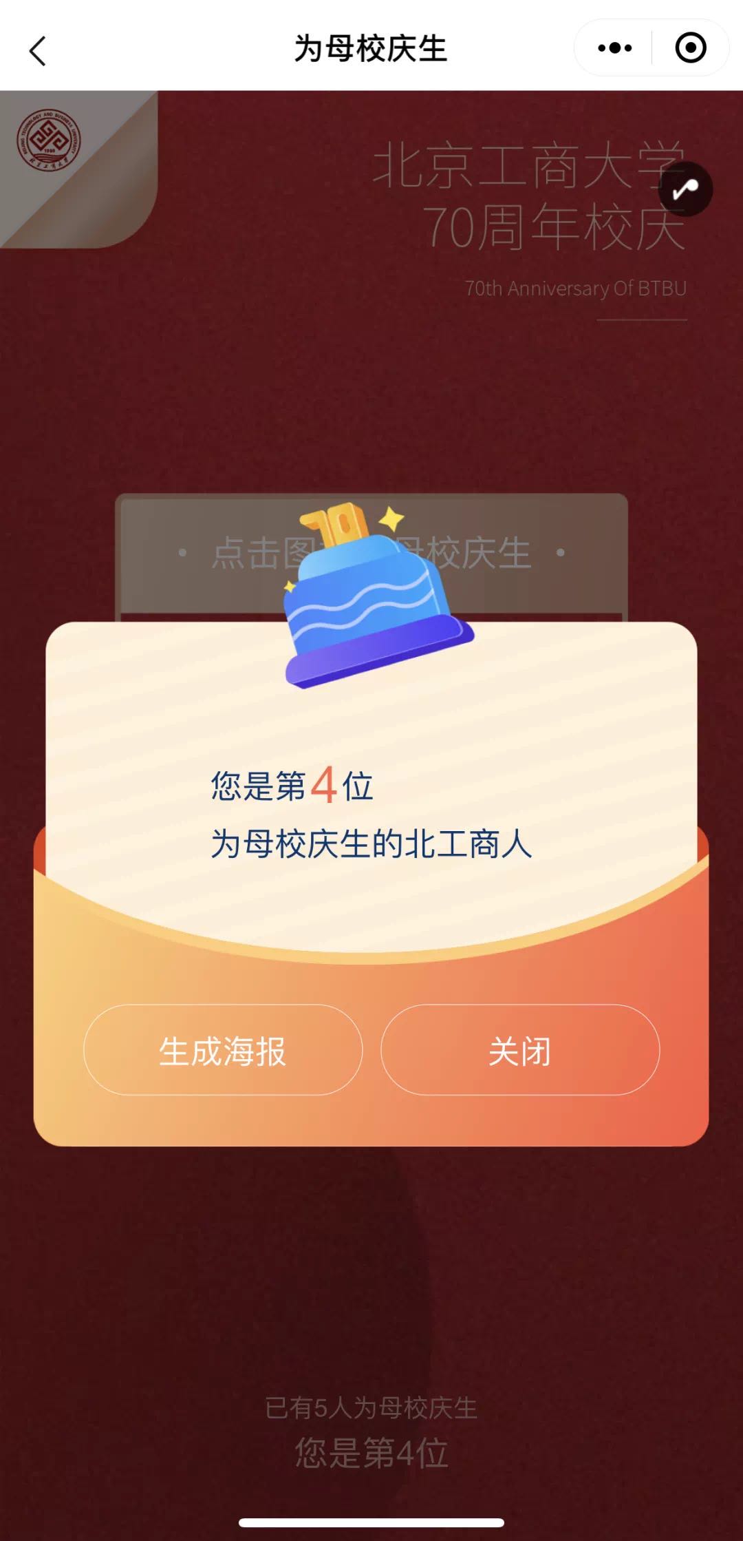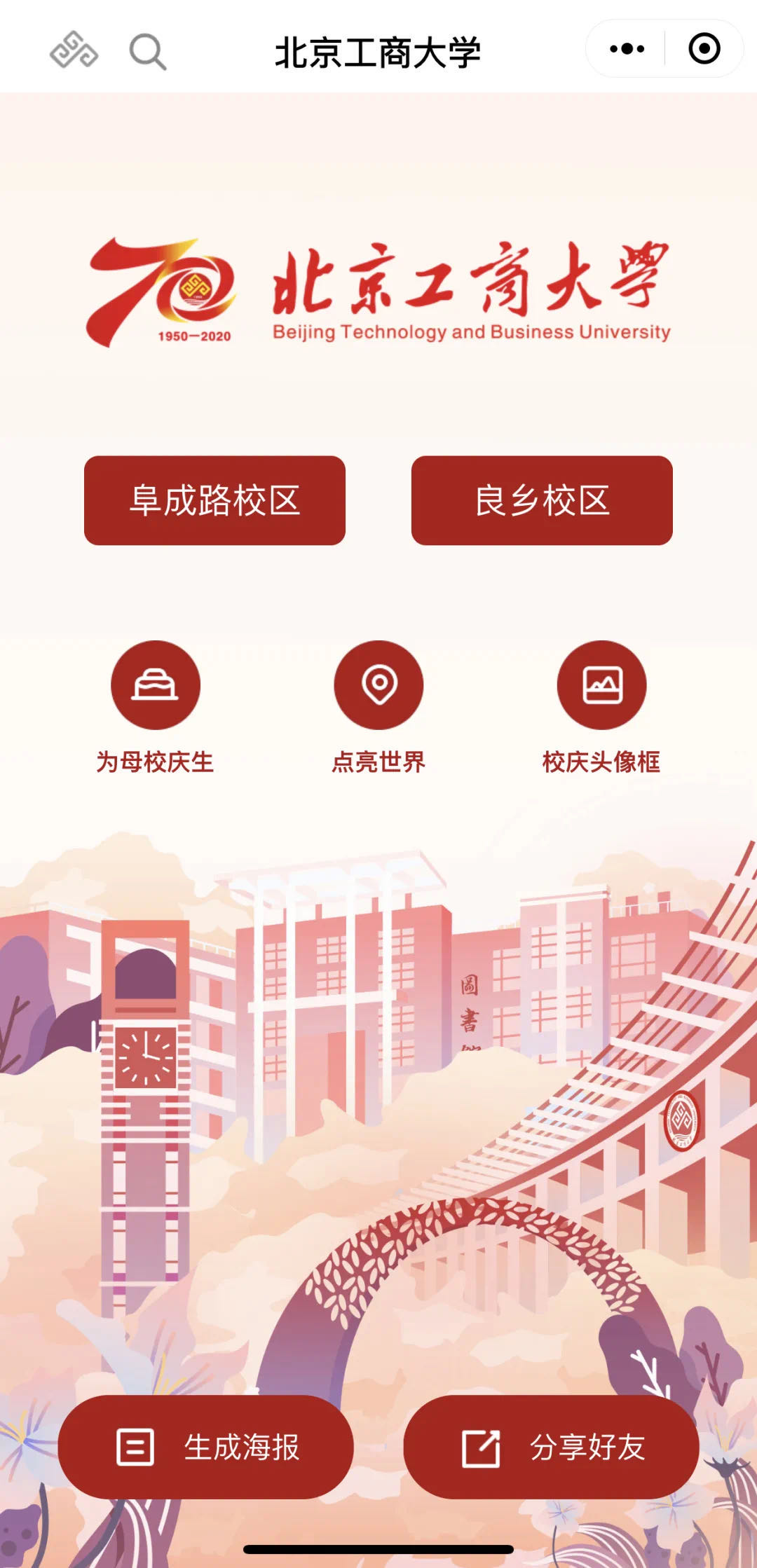 學(xué)校建校70周年校慶小程序,由黨委宣傳部、信息網(wǎng)絡(luò)中心聯(lián)合騰訊云共同研發(fā),內(nèi)含校園導(dǎo)覽(阜成路校區(qū)、良鄉(xiāng)校區(qū)全景手繪地圖)和應(yīng)用小程序(為母校慶生、點(diǎn)亮世界、校慶頭像框)等內(nèi)容 。