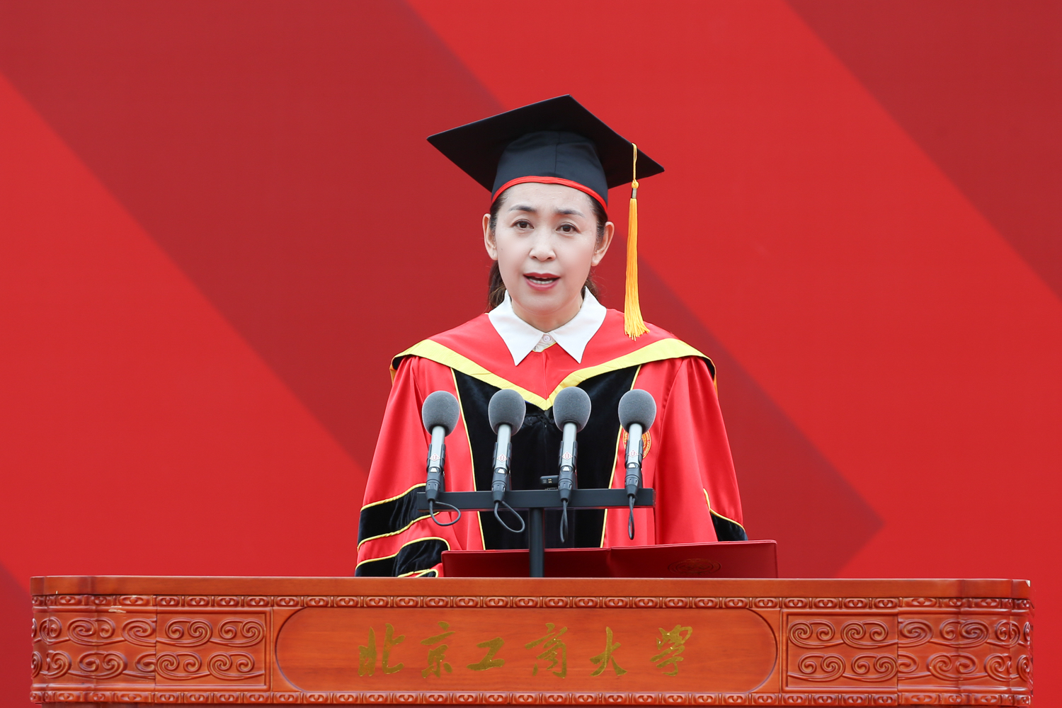 黨委常委、副校長徐丹丹宣讀《北京工商大學關于2024屆學生畢業(yè)及學位授予的決定》。