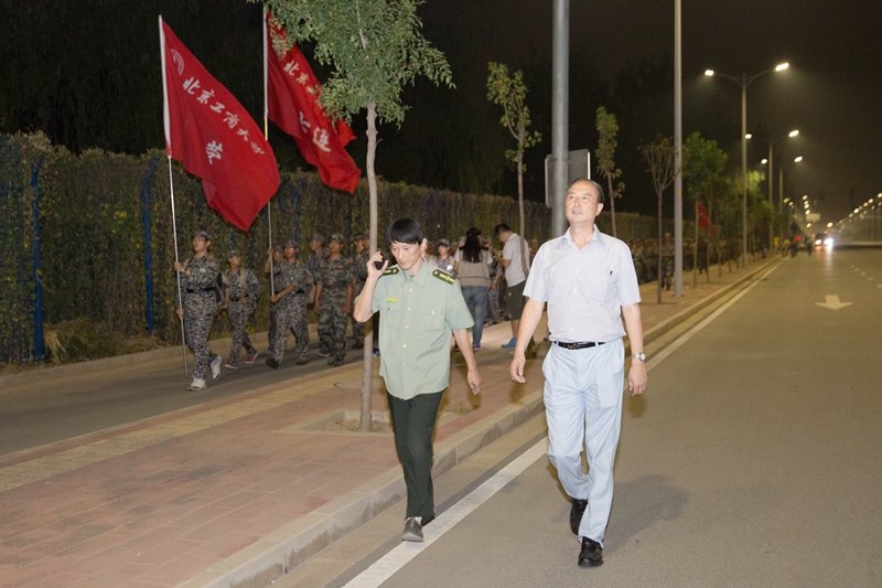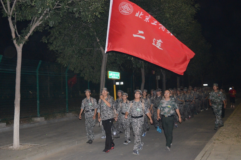“一二一……”在嘹亮的口號聲中,男生們雄赳赳氣昂昂地踏上了6公里的征程。在整個隊列的前面,一面標有“北京工商大學軍訓團”的大旗迎風飄揚,首排的男生互相照顧,輪流舉著營旗、連旗,帶領著整個隊伍奮力前進。“這是我第一次參加拉練,我背著薄被,感覺很輕松。欣賞夜景也是不錯啊。”一營一連二班的林啟栓興奮地說道。中途,雄壯的《好漢歌》吸引了同學們的注意力,充滿了男子漢氣魄的歌聲激發了大家的豪邁情感。他們邁著矯健的步伐,更加堅定地向著目的地前進。