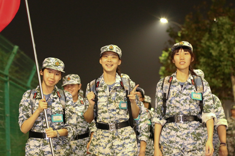 女生們在行軍途中口號響亮,并不時響起歌聲,士氣得到鼓舞,信念更加堅定。三營十二連一班的旗手說:“拉練能夠磨練人的意志,在這個過程中與同學間的友誼更深了。”在整個過程中,教官與學員伴著行進在路上,歡愉的氣氛感染著身邊每一個人。大家一路上斗志昂揚,不懼苦累。